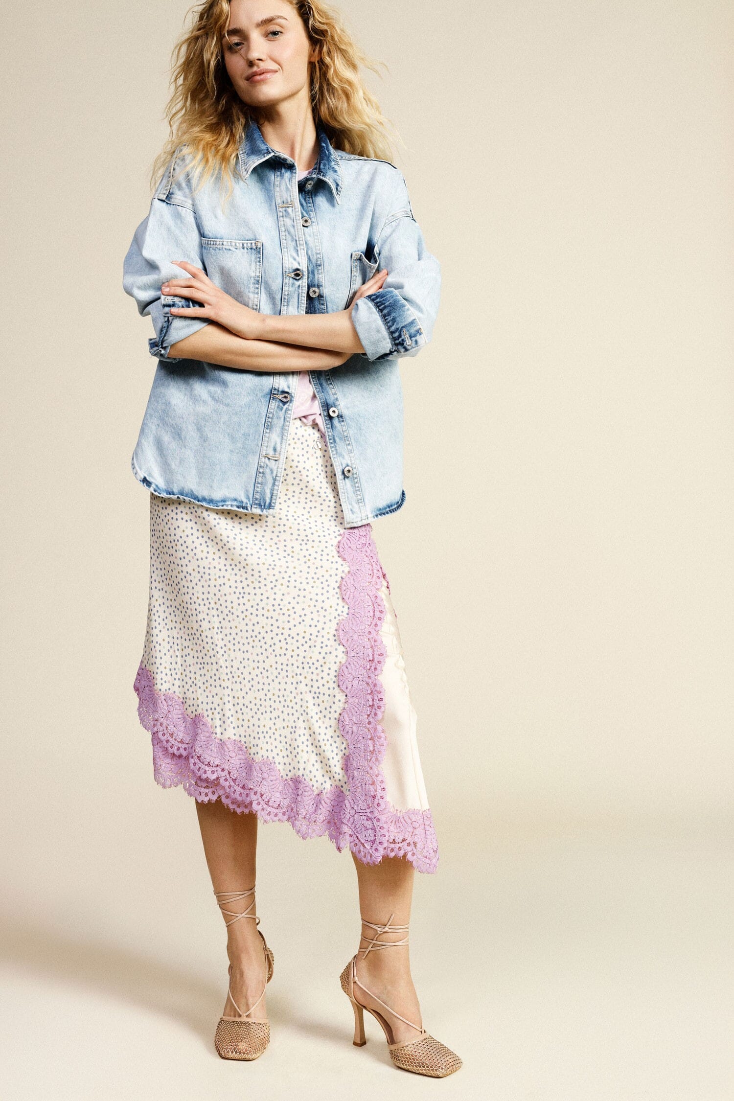 Questa gonna midi conquista con la sua stampa a pois delicata e la silhouette asimmetrica che si muove leggera ad ogni passo. Il bordo in pizzo dona un tocco distintivo e femminile. Perfetta per chi ama dettagli originali, si abbina con facilità sia a camicie che a t-shirt per un look sempre curato.