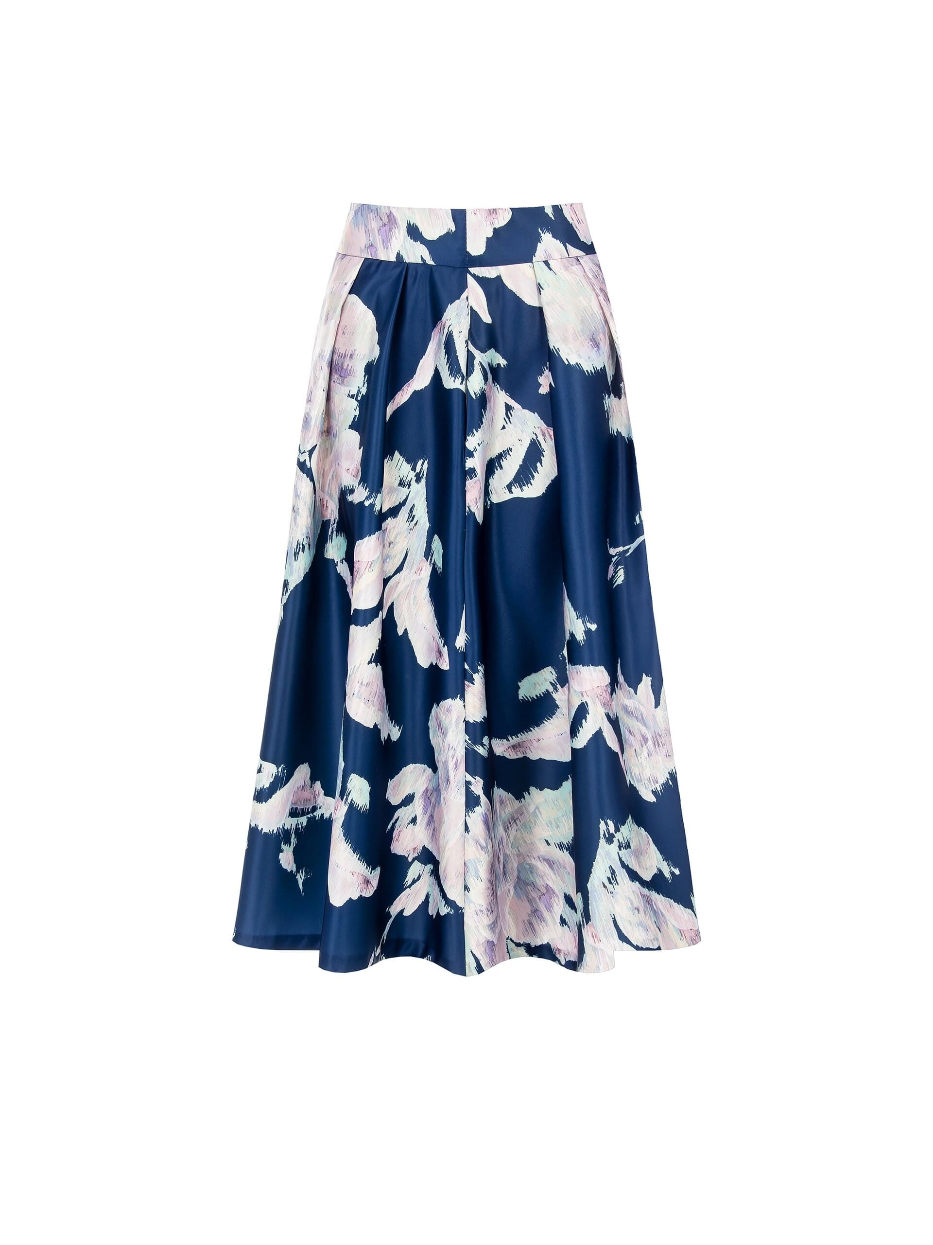 Modello midi a ruota, dalla linea morbida che assottiglia il punto vita. Realizzato in tessuto lucido, scivola leggero ad ogni passo. Pieghe profonde e chiusura sul retro disegnano una silhouette femminile, ideale dall’ufficio all’aperitivo.