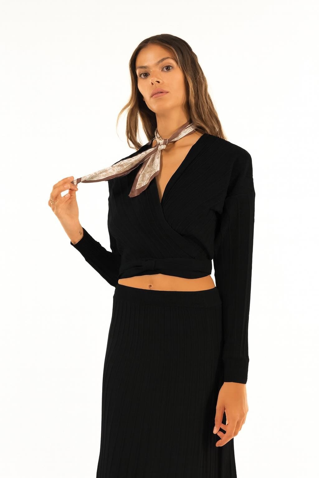 Maglia Kontatto dal fit aderente ma confortevole, in maglia fine a coste morbide che valorizza la silhouette. Scollo a V con fascio incrociato e nodo laterale regolabile, maniche lunghe e fondo corto per un effetto femminile. Perfetta con gonna o denim per ufficio smart o everyday chic.