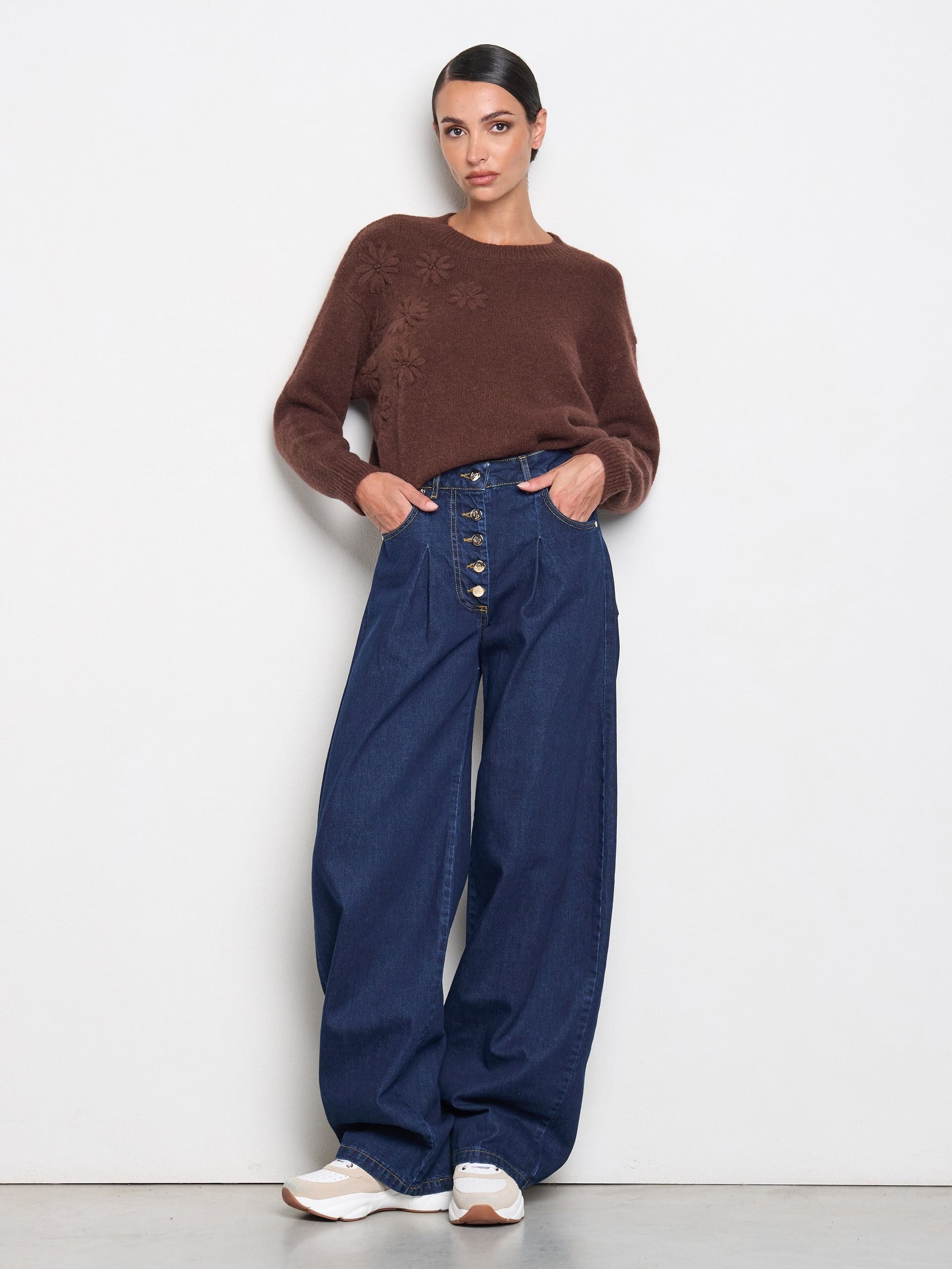 Pantaloni in denim dalla linea ampia e morbida, vita regolare che slancia la silhouette. Cotone con una leggera percentuale di stretch per comfort quotidiano. Pinces frontali e abbottonatura a vista con bottoni gioiello definiscono il punto vita. Ideali per ufficio casual e tempo libero.