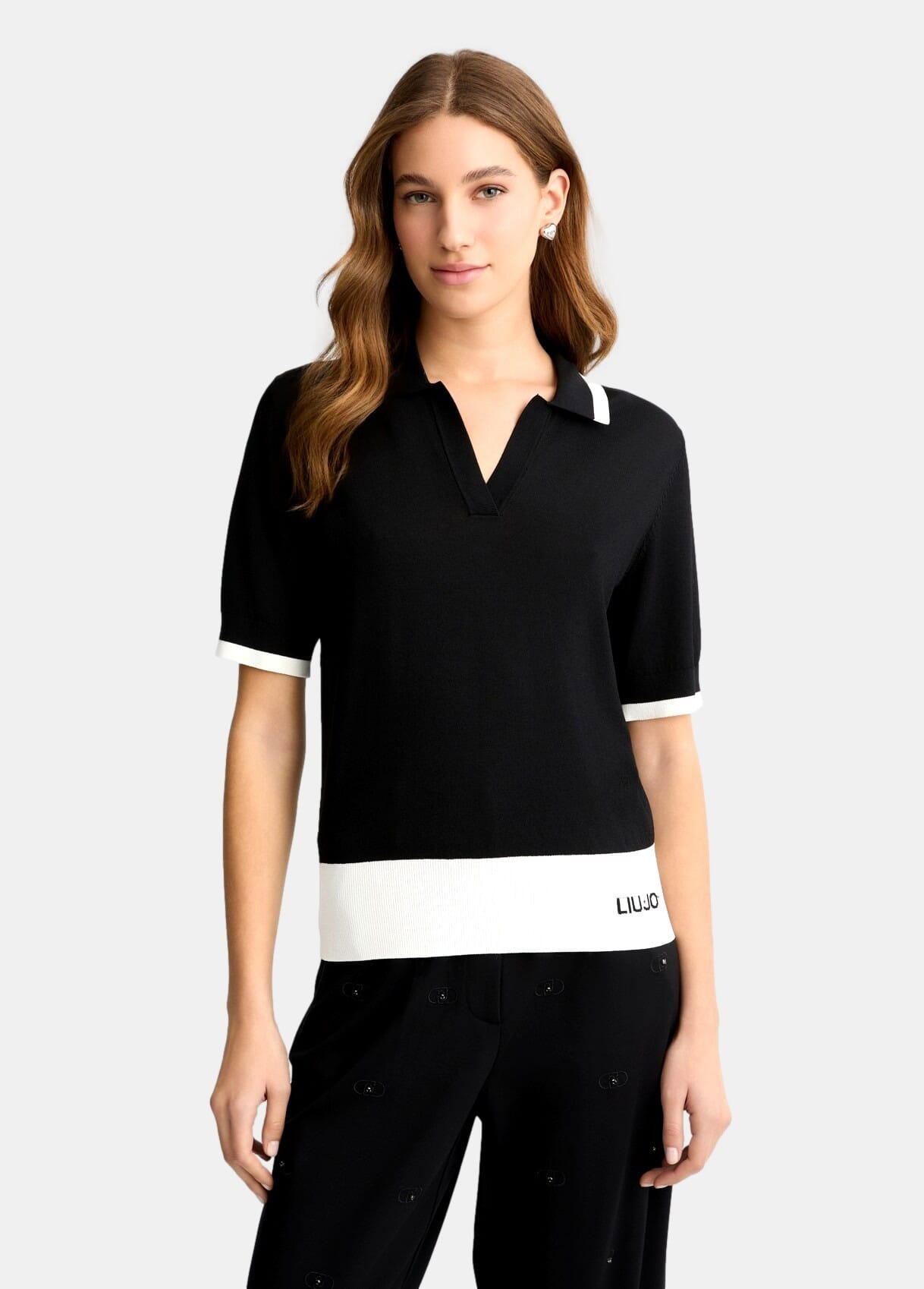 Maglia a coste,scollo a V,profili a contrasto,maniche corte,ecosostenibile.