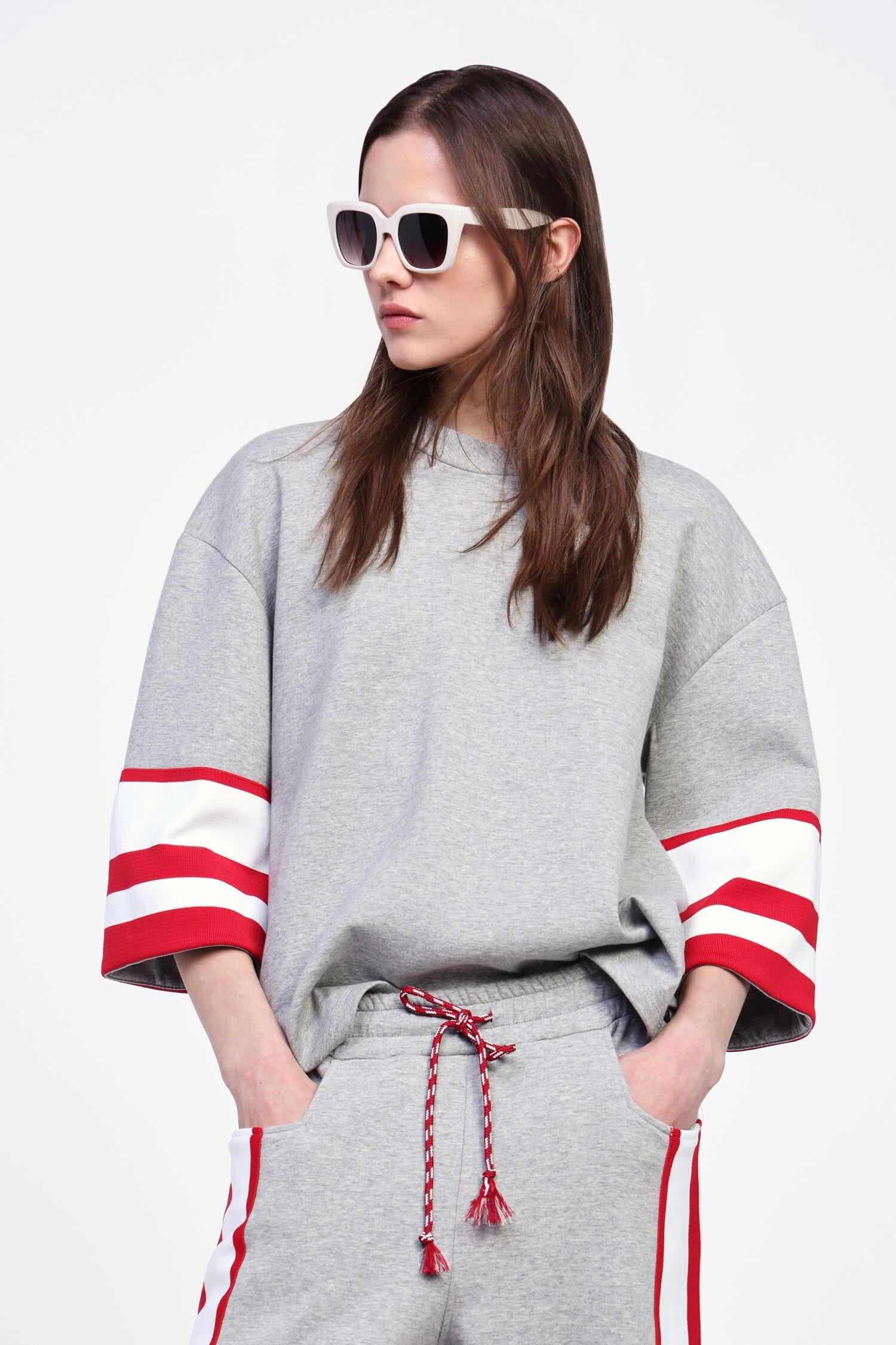 Immergiti in un comfort quotidiano con questa maglia dal taglio oversize. Le maniche a 3/4 con audaci motivi a strisce aggiungono un tocco di originalità. Il girocollo semplice incontra lo stile casual, rendendola adatta per ogni occasione informale in cui vuoi sentirti a tuo agio senza rinunciare allo stile.