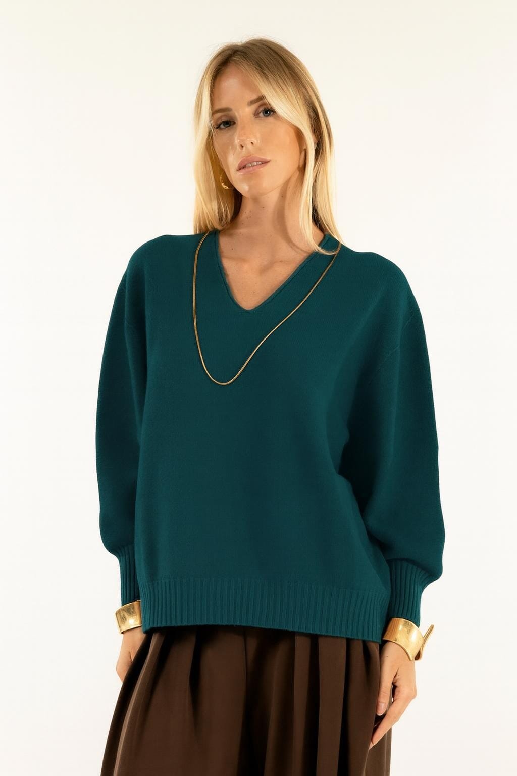 Kontatto firma un knit morbido dal fit rilassato, che cade fluido valorizzando la silhouette. Maglia soffice e compatta, piacevole sulla pelle. Scollo a V rifinito raw e maniche ampie con polsini a coste; bordo inferiore lavorato per maggiore struttura. Perfetto dall’ufficio all’everyday, facile da abbinare e stratificare.