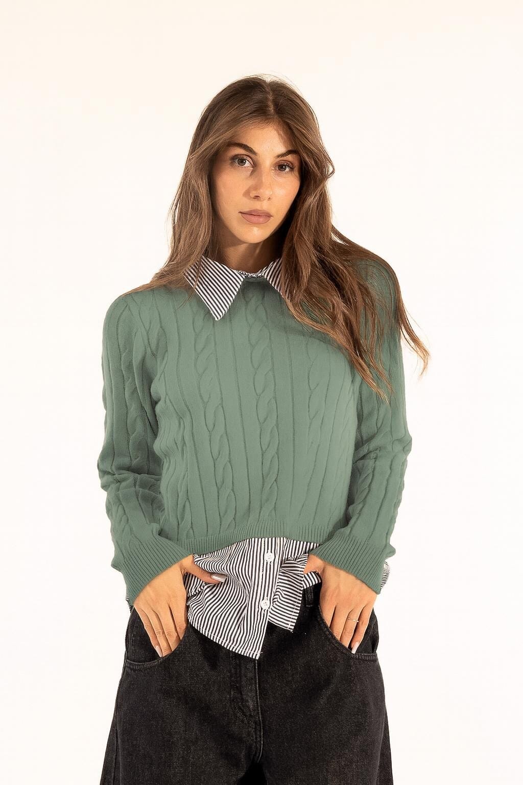 Kontatto firma un pullover dal fit regolare che valorizza la silhouette con trecce morbide e comfort quotidiano. Mix di maglia soffice e popeline rigato effetto layered: colletto a punta e baschina con bottoni a vista donano carattere. Perfetto per l’ufficio e i look everyday con denim o tailoring.