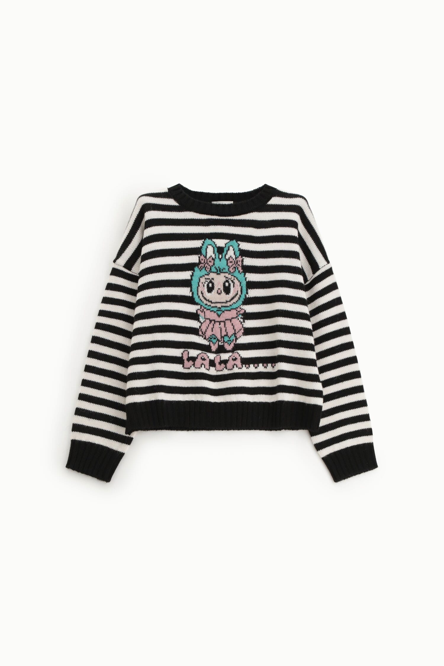 Divertente maglione a righe dal taglio comodo, impreziosito da un motivo cartoon ricamato sul davanti e scritta decorativa. Il fondo e i polsini rifiniti a costine donano comfort e carattere, perfetto per dare un tocco originale ai tuoi outfit quotidiani e per sentirsi subito a proprio agio.