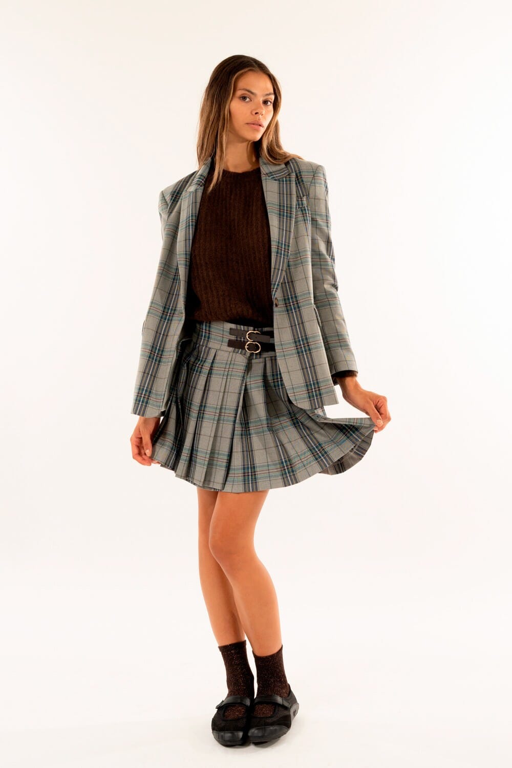 Kontatto firma una minigonna a vita media dal fit svasato, che valorizza la silhouette con pieghe morbide e movimento fluido. Tessuto a mano liscia dall’aspetto tartan. Cinturini doppi con fibbie metalliche e baschina sagomata come dettagli distintivi. Perfetta per ufficio creativo e everyday con blazer o knit.