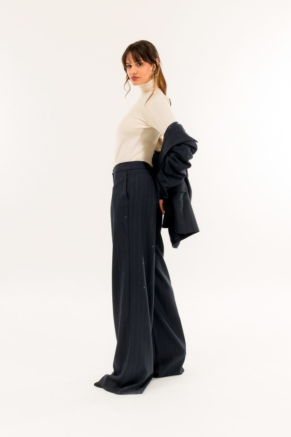 Kontatto firma un pantalone ampio a vita media, dal fit morbido e fluido che slancia la silhouette. Tessuto leggero con righe sottili e micro paillettes che illuminano con discrezione. Tasche laterali e chiusura nascosta per un profilo pulito. Perfetto dall’ufficio all’aperitivo, con blazer o top essenziale.