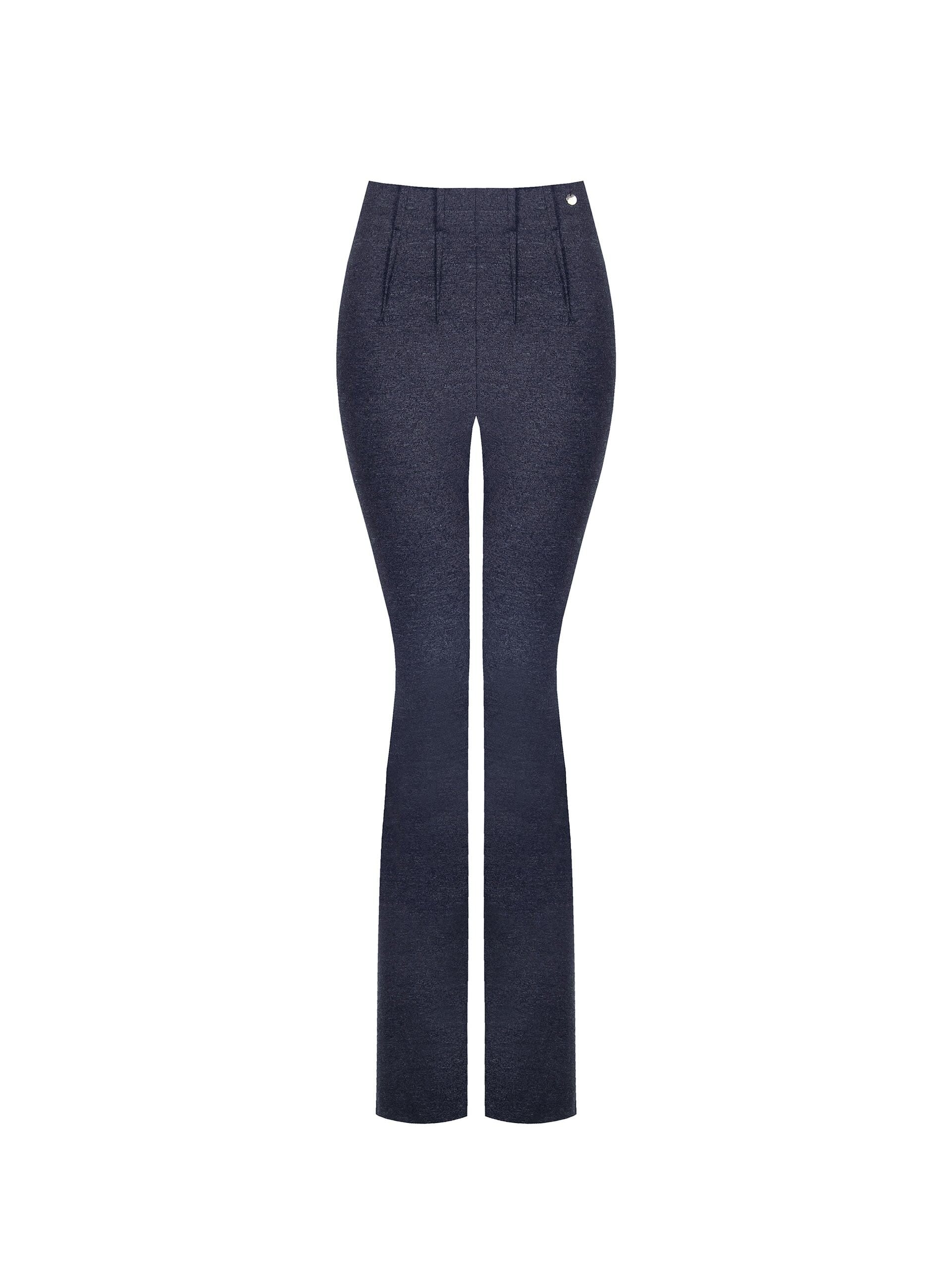 Linea slanciata con vita alta e gamba leggermente svasata, effetto silhouette allungata. Tessuto compatto e stretch dall’aspetto mélange, confortevole tutto il giorno. Pieghe impunturate sul davanti e micro charm in vita. Perfetto per l’ufficio e gli after‑work: si abbina facilmente a blazer e décolleté.