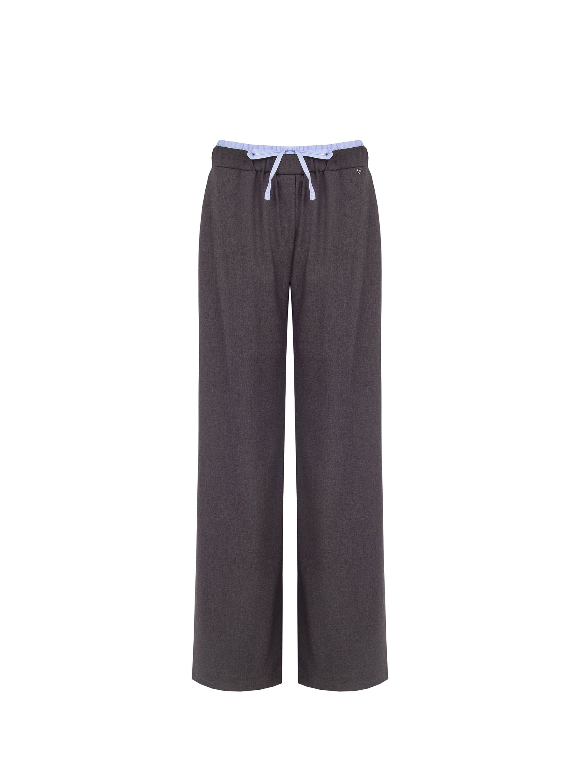 Rinascimento firma un modello wide leg dal fit morbido e fluido che slancia la silhouette. Realizzato in tessuto leggero effetto lana, assicura comfort tutto il giorno. Vita elasticata con coulisse a contrasto e micro-logo laterale. Perfetto dall’ufficio al tempo libero, si abbina con blazer o knit.