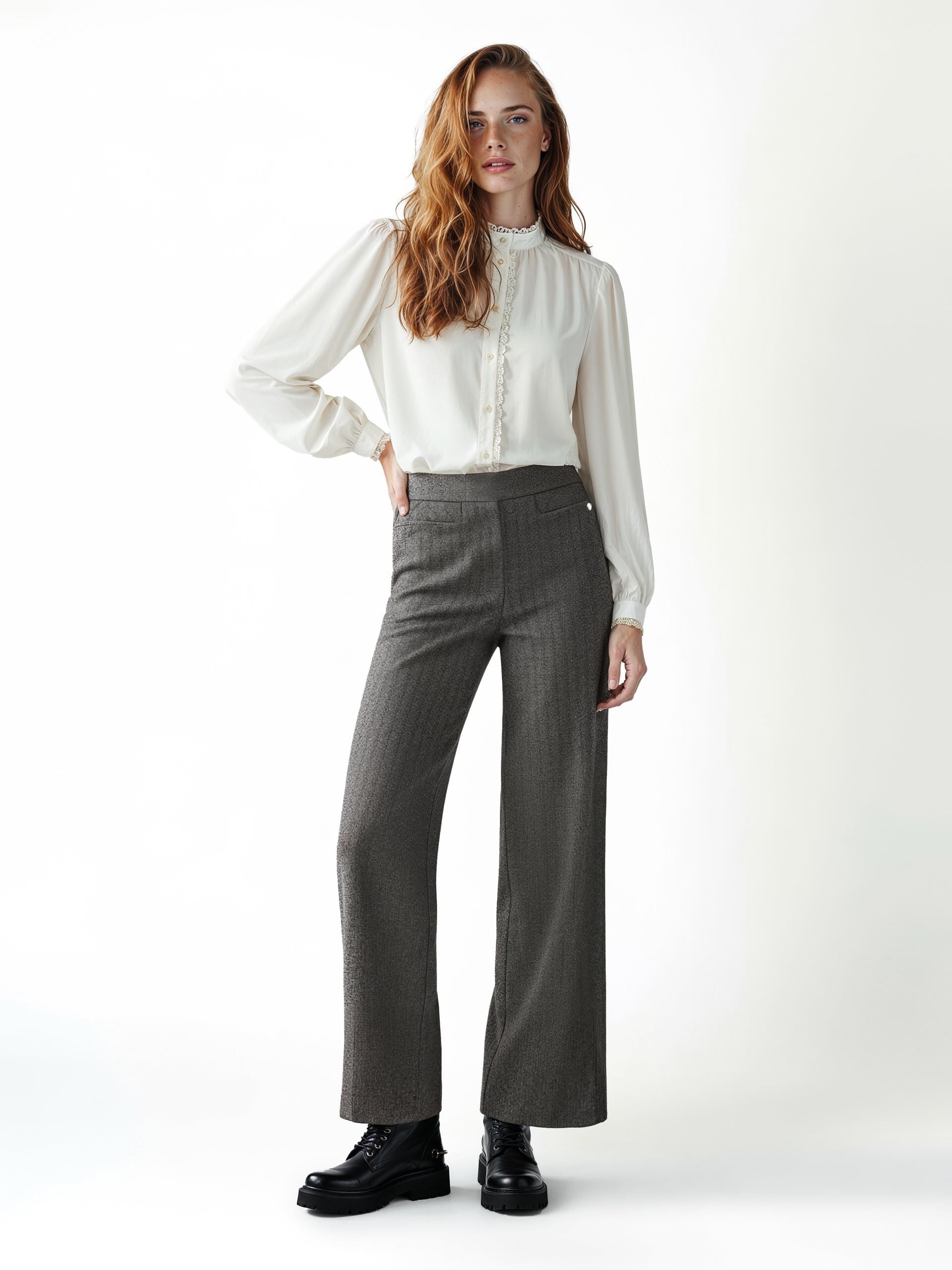 Linea dritta e vita media per un fit comodo che allunga la silhouette. Tessuto morbido con motivo spigato, elasticizzato per muoverti con facilità. Tasche con pattina e micro charm metallico aggiungono un tocco ricercato. Perfetto dall’ufficio all’aperitivo: elegante, versatile, sempre impeccabile.