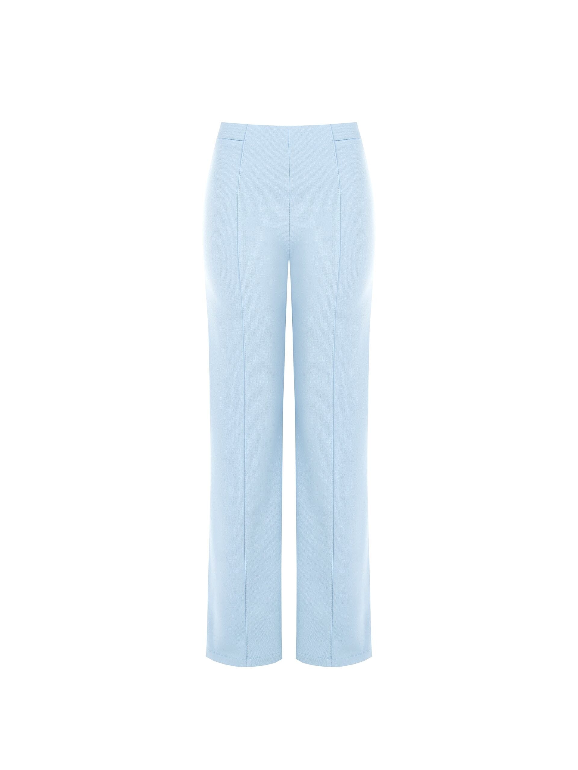 Pantaloni a vita alta in tessuto fluido leggermente stretch, con gamba dritta che slancia la figura. Le pieghe centrali e le tasche a filetto aggiungono un tocco sartoriale, mentre la chiusura invisibile assicura una linea pulita. Perfetti dall’ufficio all’aperitivo.