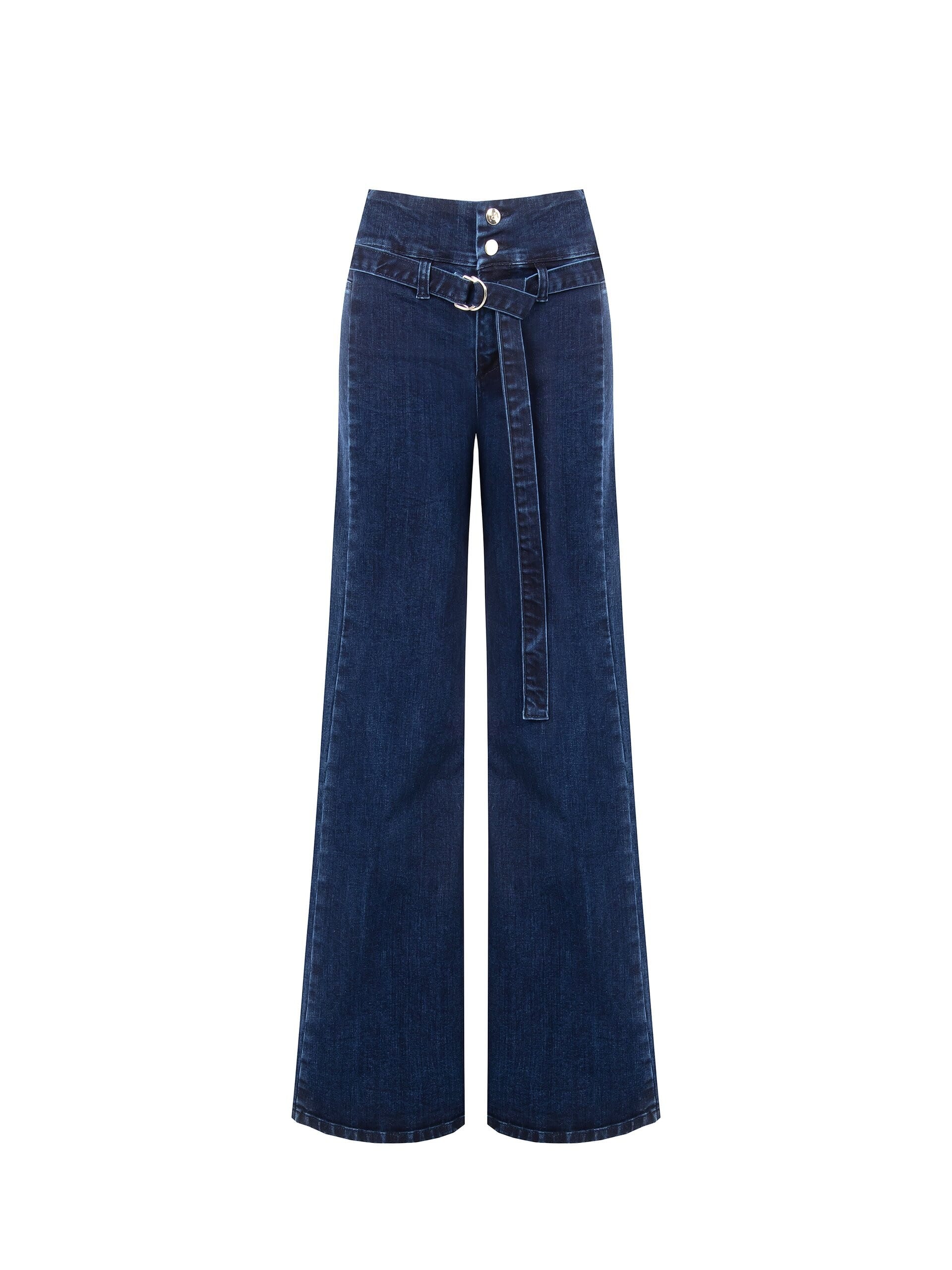 Linea ampia e vita alta in denim morbido che avvolge il punto vita e slancia la silhouette. La cintura con fibbia a doppio anello e i bottoni metallici aggiungono un tocco deciso. Perfetto dal daily look con blazer al dopo lavoro con sandali alti.