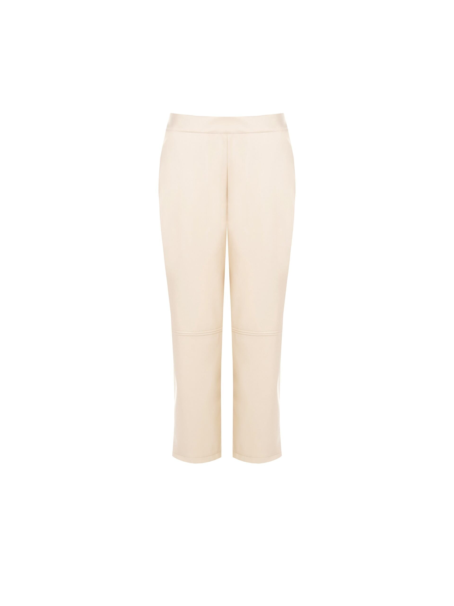 Modello a gamba dritta e lunghezza alla caviglia, in morbida eco‑pelle liscia che segue la silhouette senza stringere. Vita pulita con zip posteriore invisibile e cuciture al ginocchio che slanciano la figura. Ideale dall’ufficio all’aperitivo con un cambio di top.
