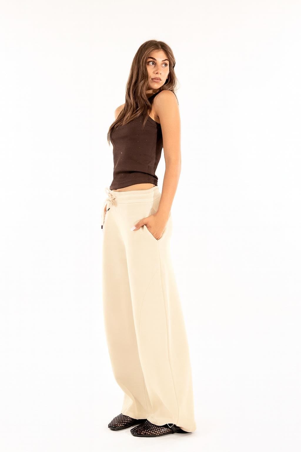 Kontatto firma un pantalone dal fit rilassato e gamba dritta che slancia la silhouette. Realizzato in felpa morbida e consistente per un comfort avvolgente. Vita elasticata con cordoncino intrecciato e tasche laterali per praticità. Ideale per everyday urbano, viaggio e tempo libero con stile.