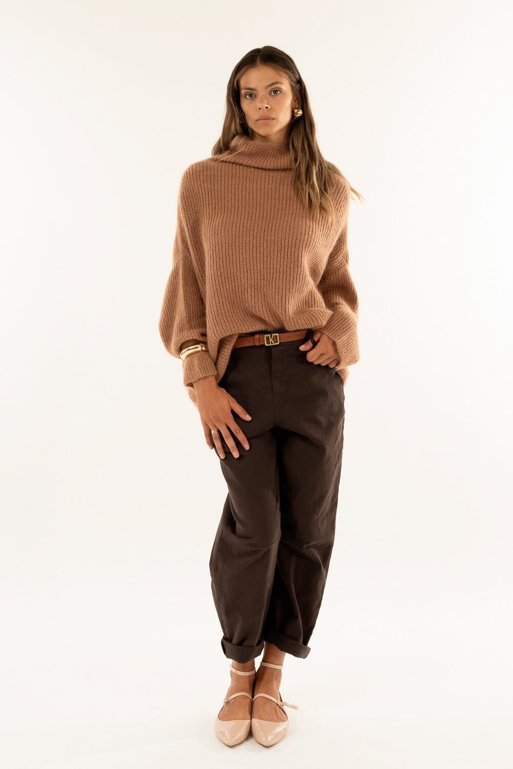 Kontatto reinterpreta il pantalone relaxed: vita bassa e gamba morbida a botte che slancia senza stringere. Realizzato in cotone con mano leggermente strutturata per comfort e tenuta. Chiusura frontale con bottone e tasche applicate sul retro, fondo arrotolabile. Perfetto per everyday e casual Friday.