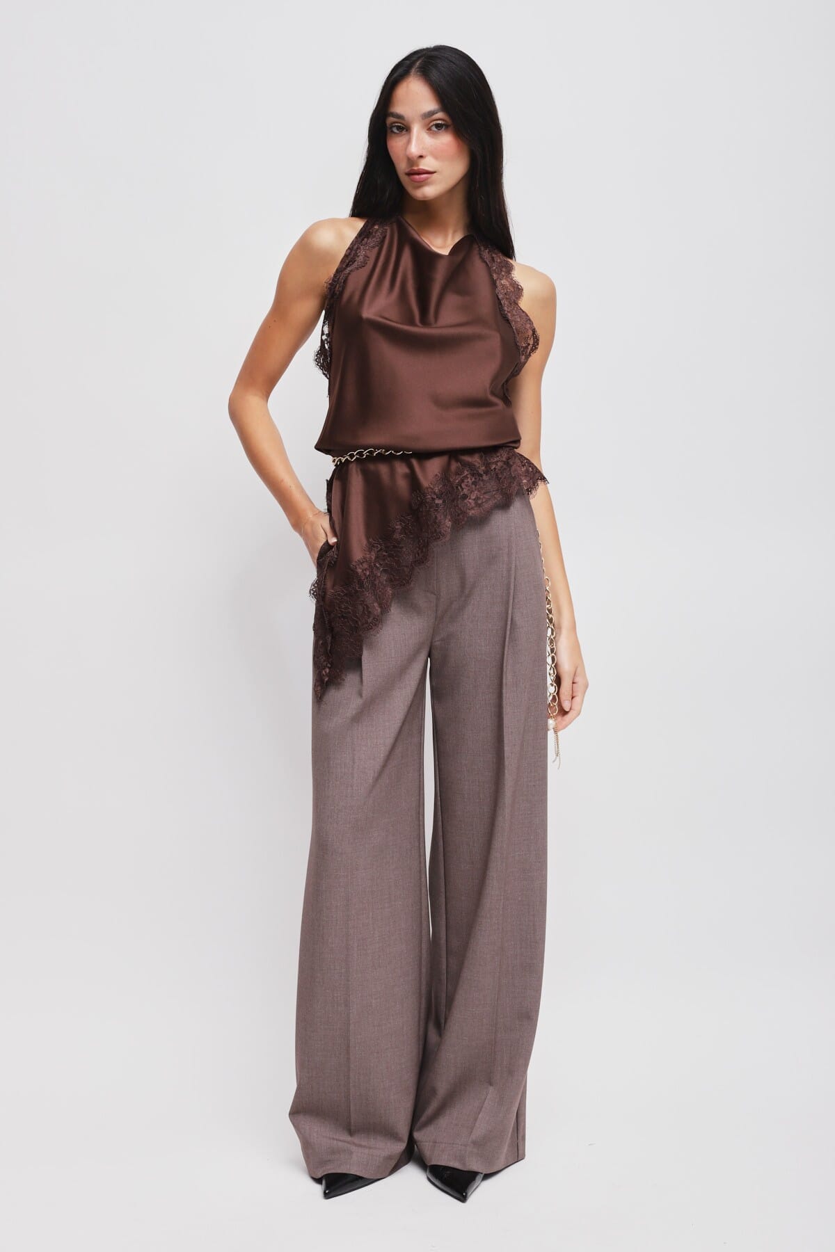 Maryley firma pantaloni dal fit ampio e fluido, vita regolare e linea che allunga la silhouette. Realizzati in tessuto leggero e morbido al tatto, con pince frontali e tasche laterali per comfort quotidiano. Chiusura con zip nascosta. Perfetti per l’ufficio e per look serali con blazer e sandali.