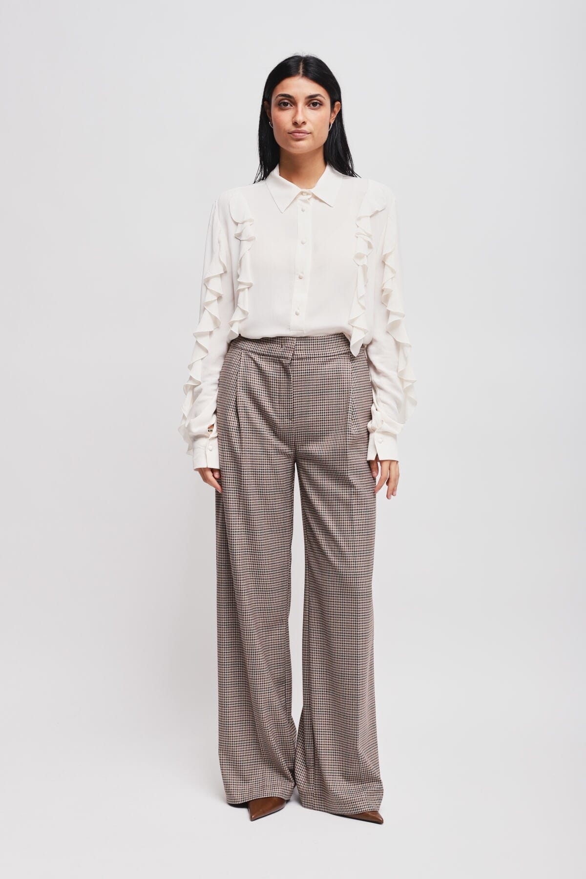 Maryley firma un pantalone dal fit ampio e fluido che slancia la silhouette. Tessuto compatto con micro pied de poule, piacevole sulla pelle e stabile in caduta. Vita alta con pinces e chiusura nascosta; tasche laterali per praticità. Perfetto per l’ufficio e per serate smart, si abbina a blazer o camicie morbide.