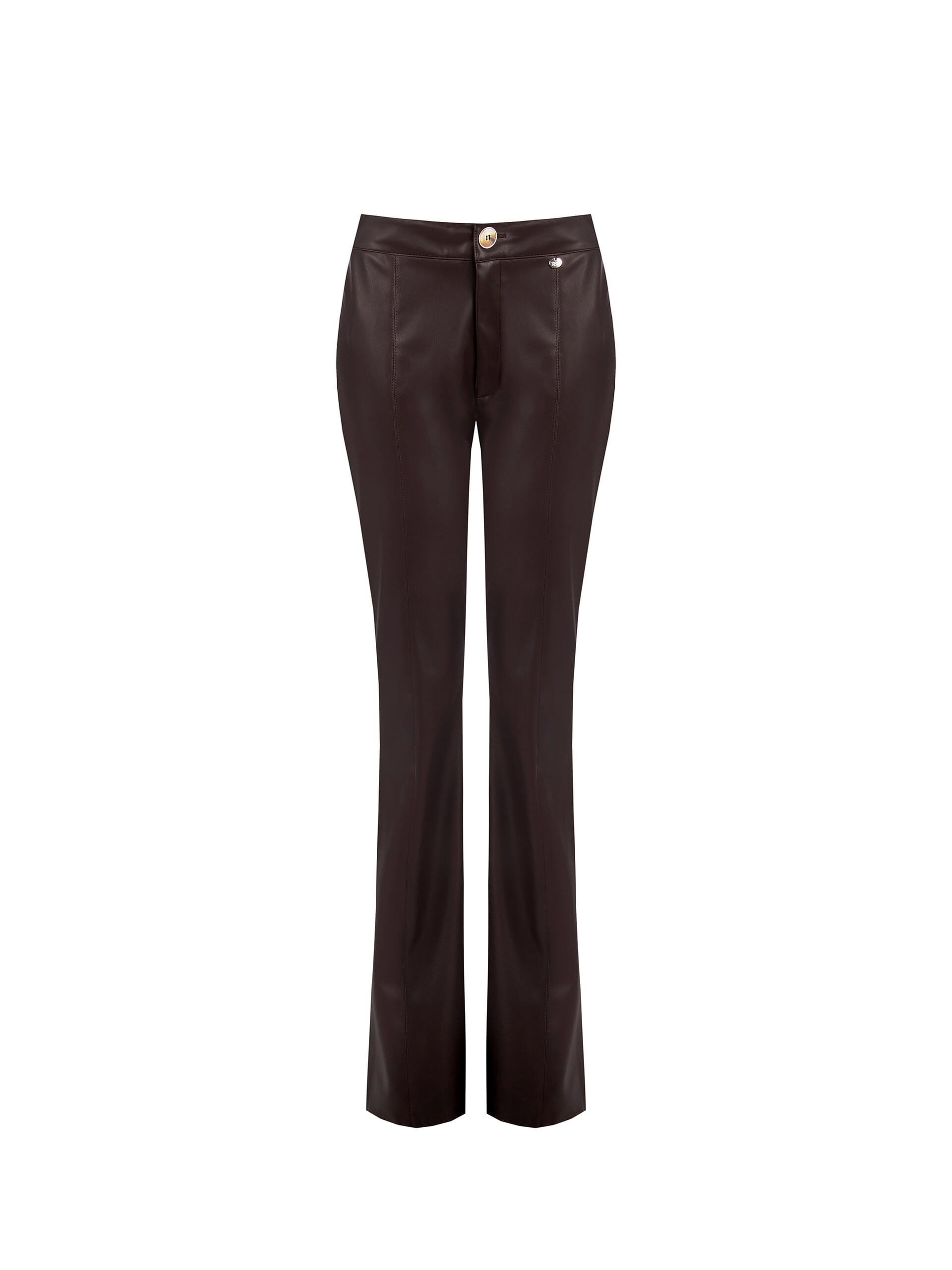 Pantaloni svasati dal fit aderente sulla coscia e leggermente flare sul fondo: slanciano la silhouette e seguono i movimenti. Realizzati in morbida similpelle effetto matte con interno confortevole. Vita media con bottone gioiello e impunture sul retro. Perfetti per l’ufficio con blazer, pronti per la sera con sandali.