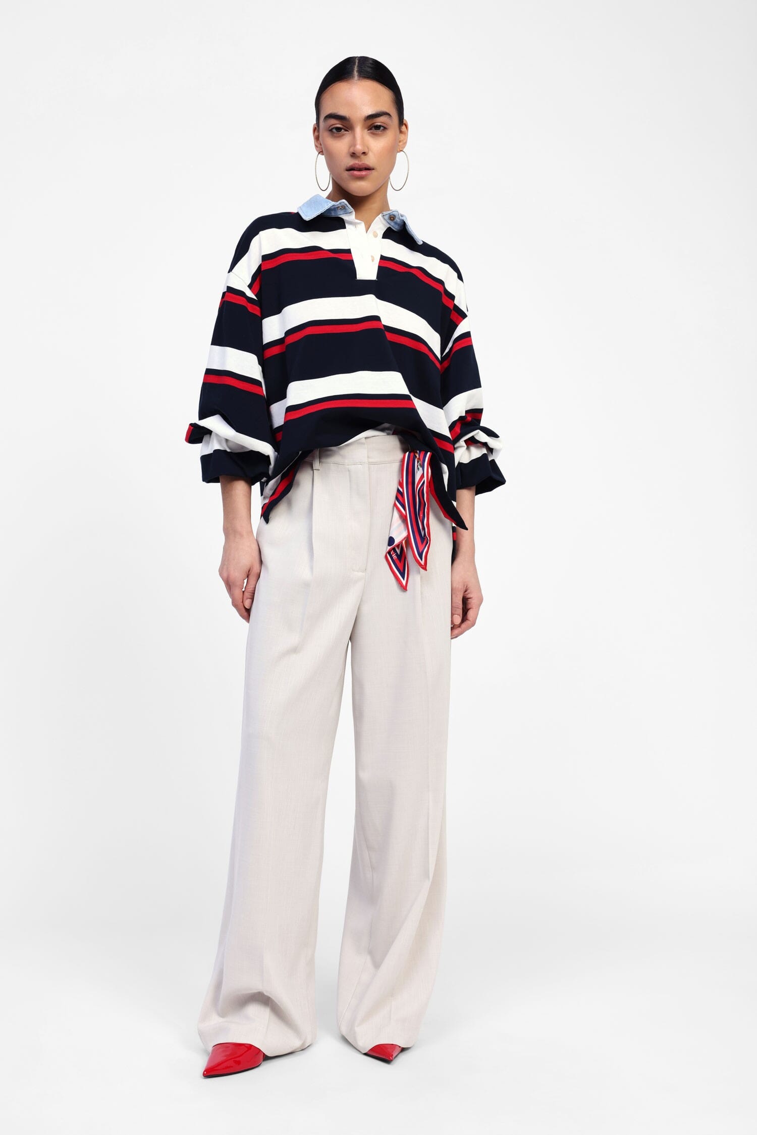 Scopri un pantalone palazzo che incarna l'arte del vestire con personalità. Il dettaglio del foulard aggiunge un tocco di estro alla silhouette ampia, perfetta per una giornata in città o un'occasione speciale. Eleva il tuo guardaroba con questo capo che parla di te e del tuo stile unico.