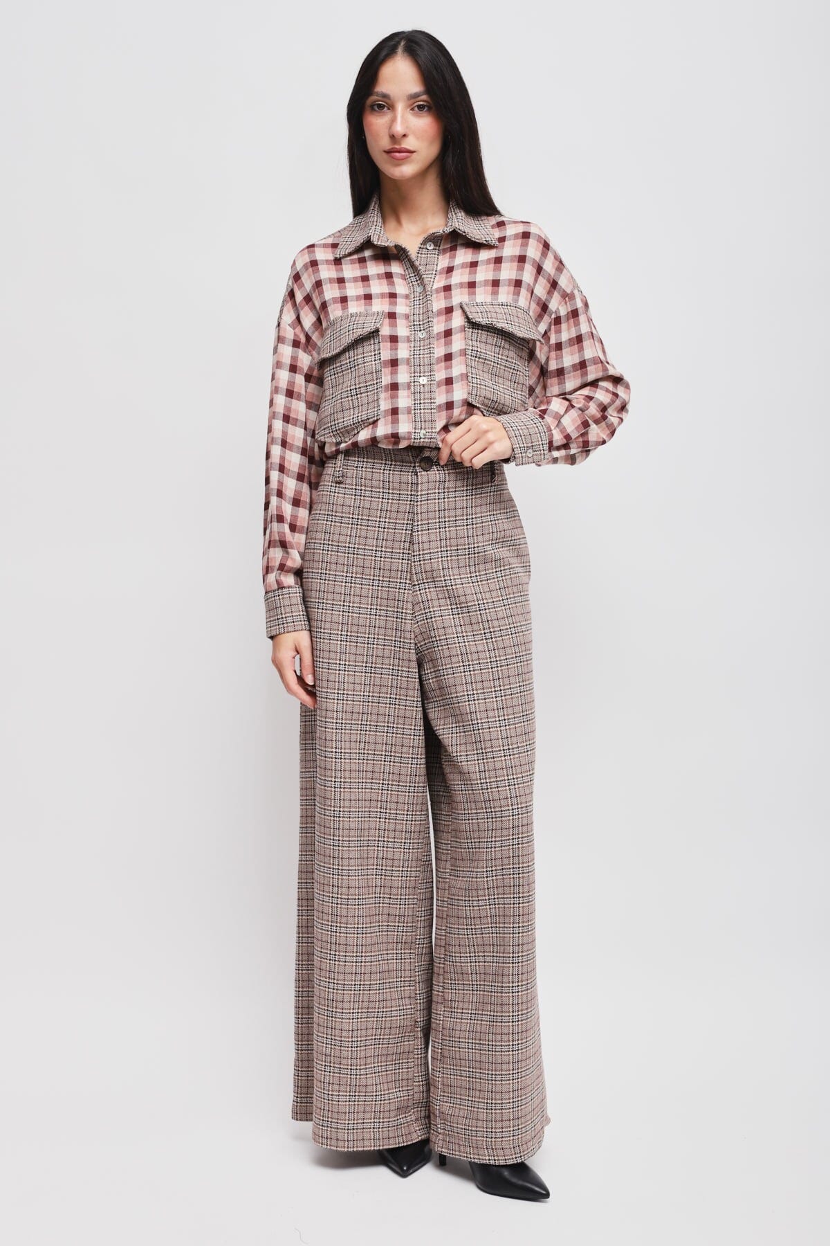 Maryley firma un pantalone ampio a vita alta dal fit fluido che slancia la silhouette. Tessuto morbido a trama check, piacevole sulla pelle. Chiusura con bottone e zip, tasche laterali per praticità. Perfetto dall’ufficio all’aperitivo: comfort all-day, stile deciso e versatile.