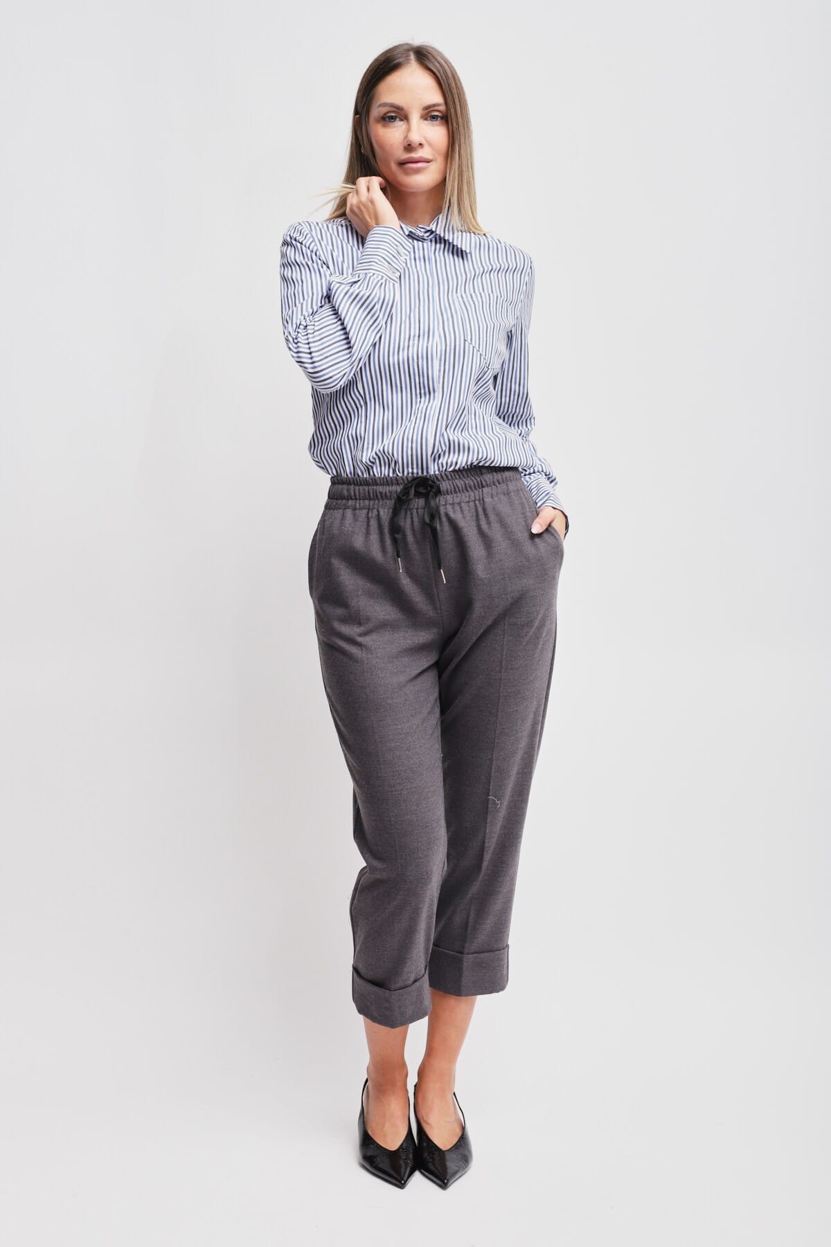 Maryley firma un modello relaxed a vita elastica che valorizza la silhouette senza rinunciare al comfort. Jersey morbido e compatto, mano soffice. Dettagli chiave: coulisse con finalini metallici, piega stirata frontale e fondo risvoltato. Perfetto per l’ufficio con tacchi, versatile per l’everyday con sneaker.