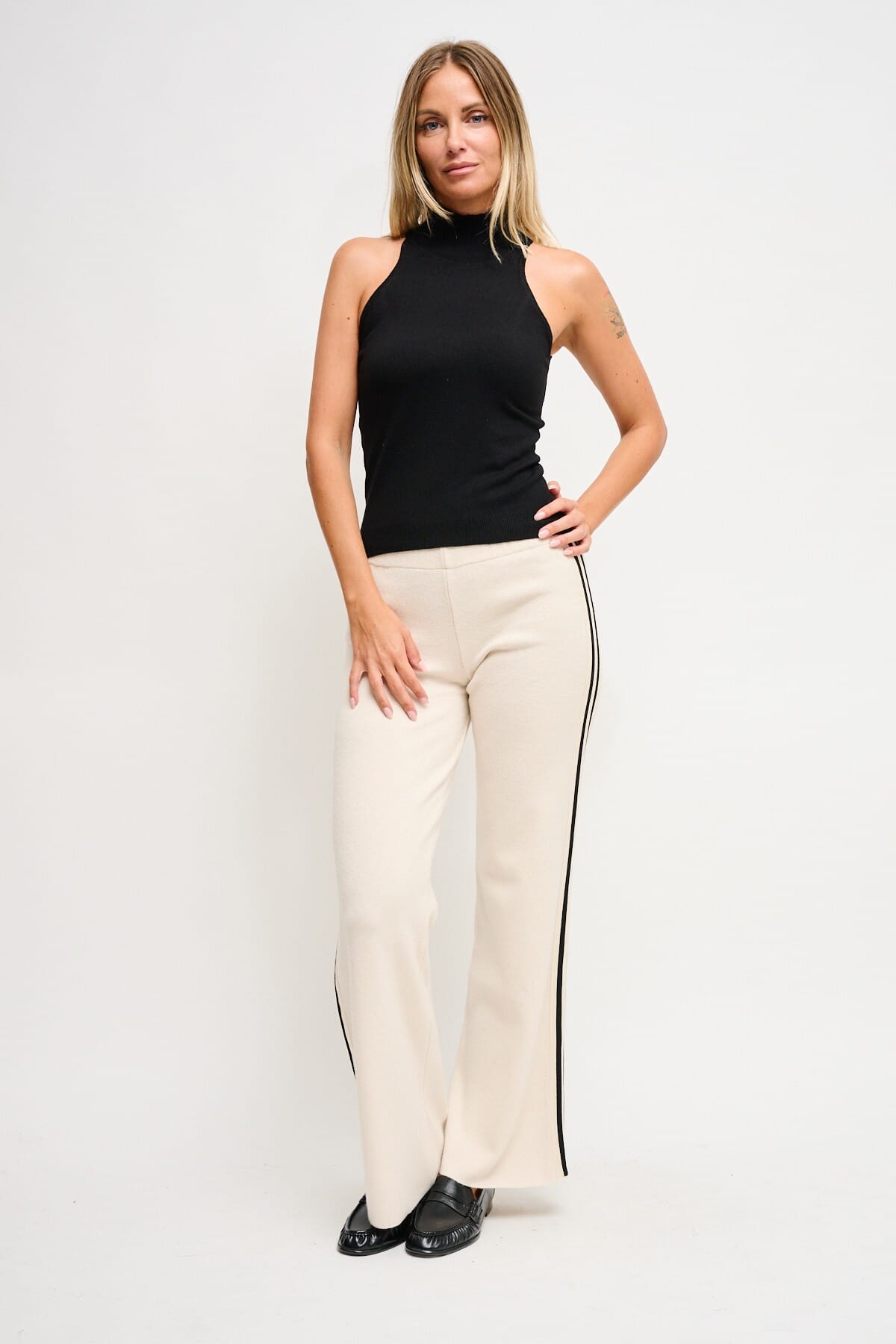 Maryley firma un pantalone in maglia dal fit dritto e morbido, che slancia senza stringere. La texture tricot regala comfort tutto il giorno, mentre le bande laterali donano un accento sport-chic. Vita elasticata e fondo leggermente ampio per massima libertà. Perfetto per ufficio smart e everyday.