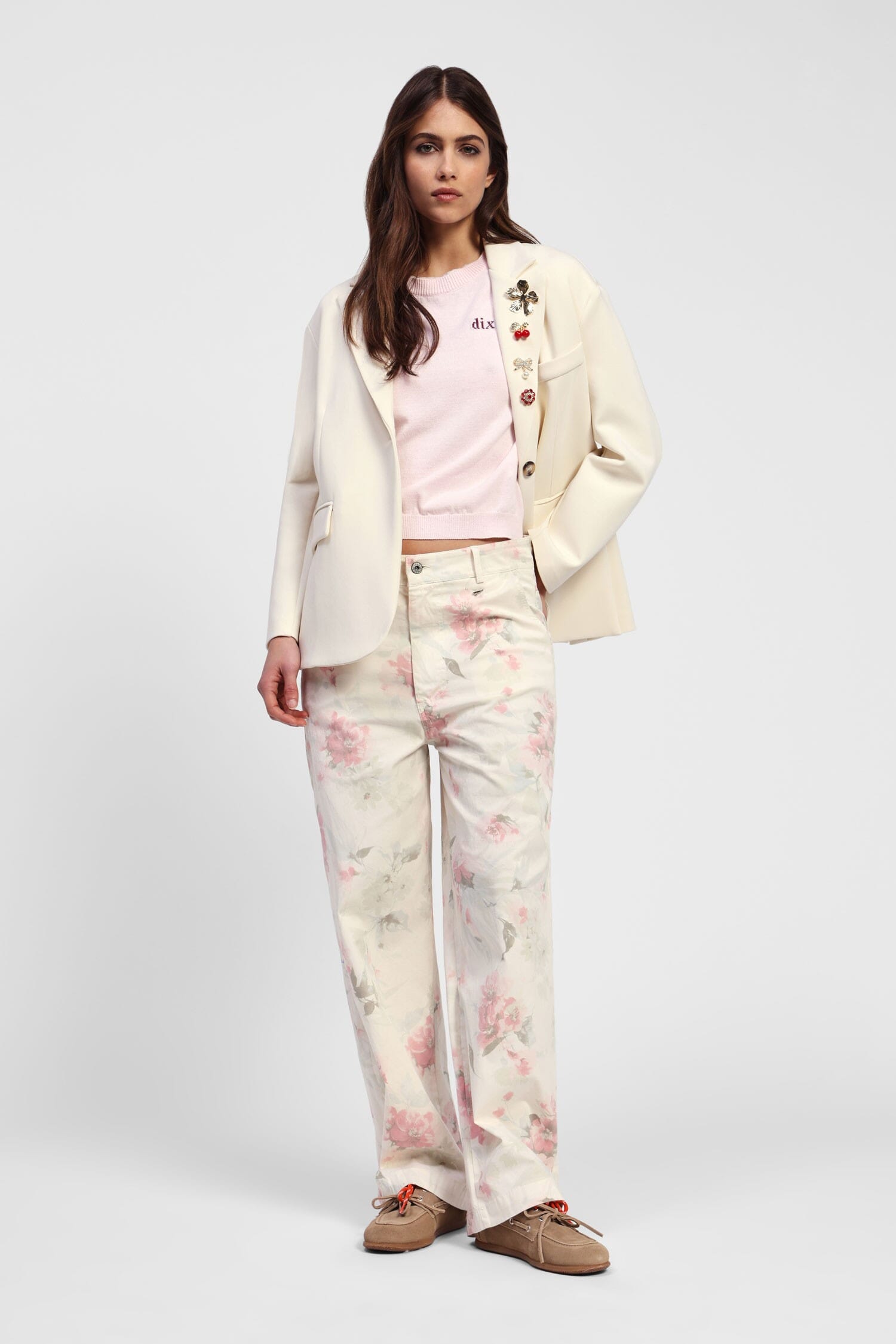 Pantaloni ampi che scivolano con grazia, decorati con un delicato motivo floreale che evoca eleganza e freschezza. Con una vita alta che scolpisce la silhouette, sono pensati per accompagnarti nelle tue giornate con comfort e stile. Perfetti per un look casual ma curato, offrono un'eleganza quotidiana senza sforzo.