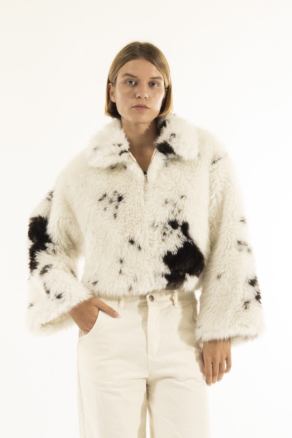 Kontatto firma un capospalla corto e morbido, dal fit rilassato che valorizza la vita. Pelliccia sintetica effetto shearling, calda e soffice al tatto. Colletto strutturato e chiusura a zip nascosta per una linea pulita. Perfetto da giorno in città e per un aperitivo, dona carattere a denim e abiti.