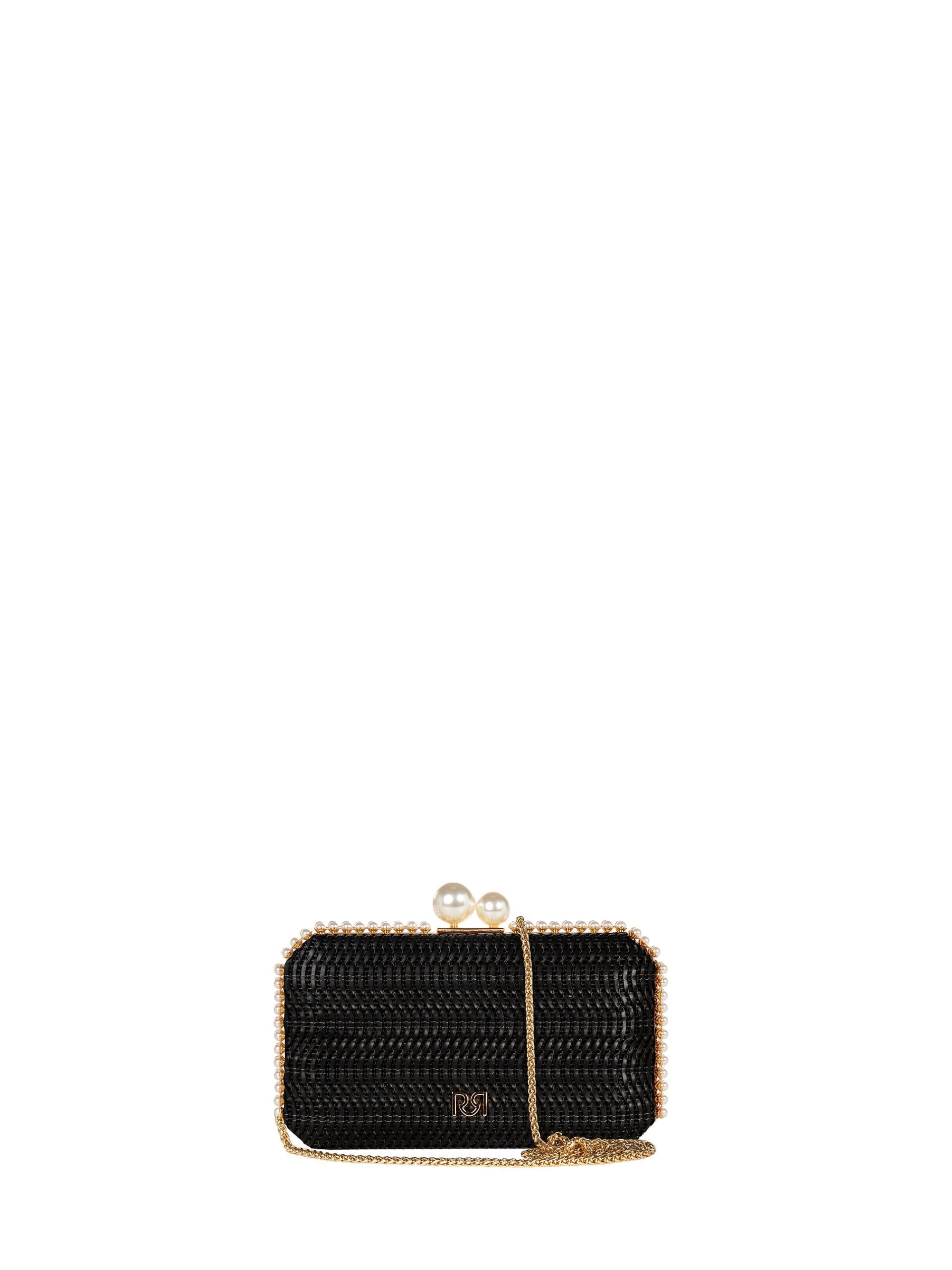 Minibag a struttura boxy con elegante lavorazione a trama ispirata alla paglia. Il bordo impreziosito da perle e la chiusura gioiello illuminano ogni gesto. La catenella staccabile permette di indossarla a spalla o a mano, ideale per party e cerimonie.