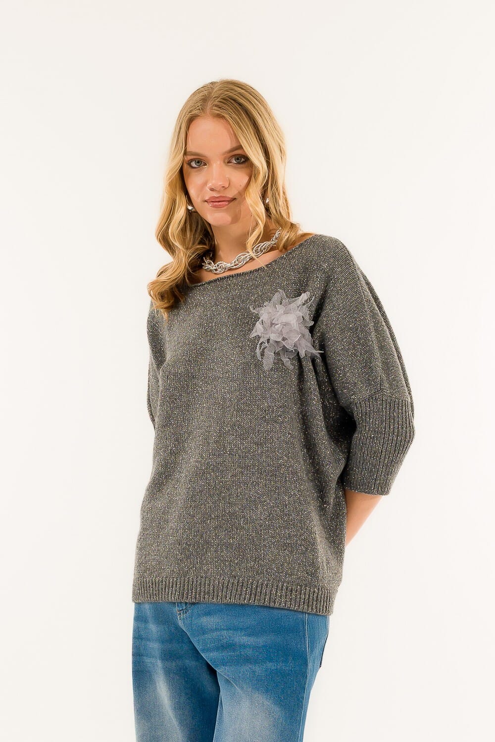 Maglia Kontatto dal fit morbido e scivolato, confortevole sulle spalle. Lavorazione tricot con filo leggermente luminoso per una texture soffice e raffinata. Dettagli: linea ampia con maniche a tre quarti e spilla floreale removibile sul petto. Versatile da ufficio a aperitivo, valorizza la silhouette senza costringere.