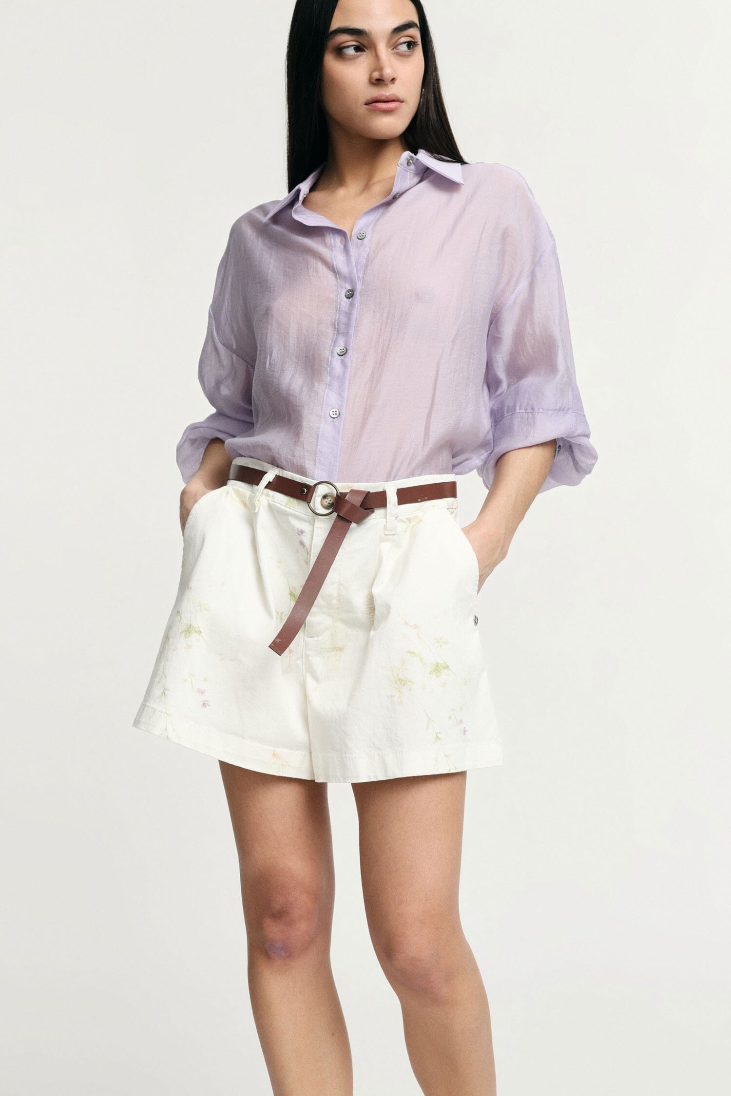 Shorts regular-fit dal taglio ampio e rilassato con tasche laterali, impreziositi da una stampa delicata e arricchiti da una cintura a contrasto con fibbia metallica. Perfetti per dare grinta al look di tutti i giorni senza rinunciare a comfort e praticità, ideali per outfit divertenti e versatili da città.