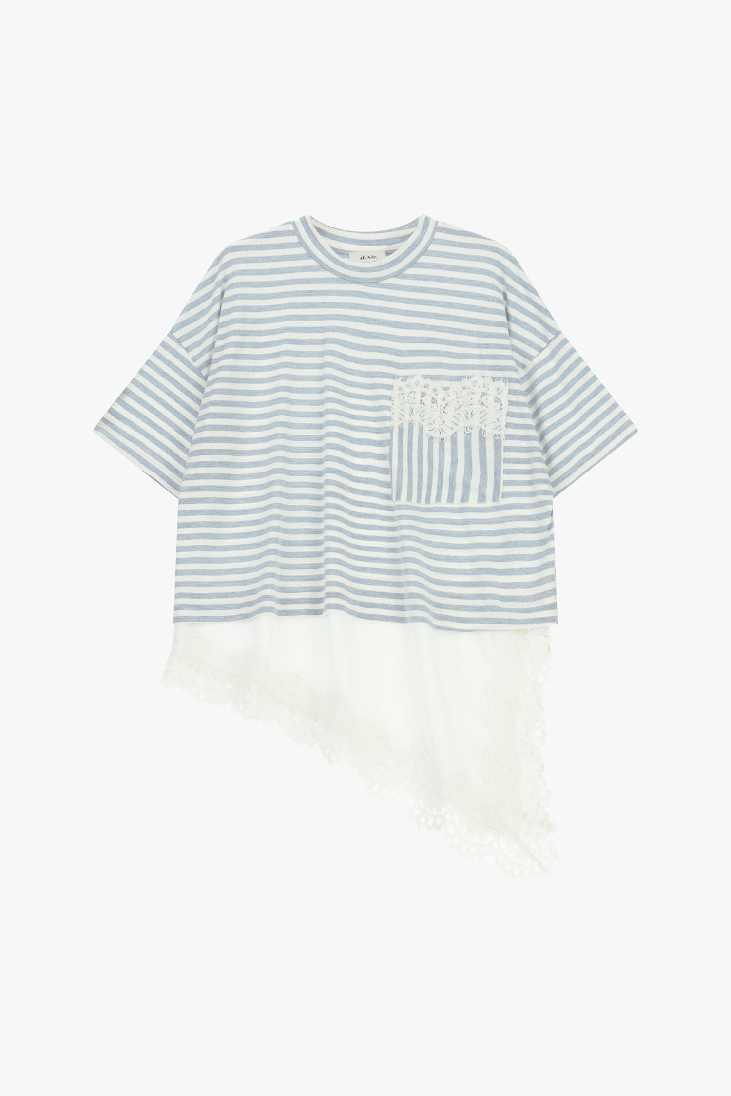 Gioca con lo stile grazie a questa t-shirt a righe dal taglio morbido, arricchita da una tasca sul petto decorata con inserto in pizzo e da un originale bordo inferiore asimmetrico rifinito con pizzo. Perfetta con jeans o gonne per chi cerca un look fresco, romantico e curato nei dettagli.