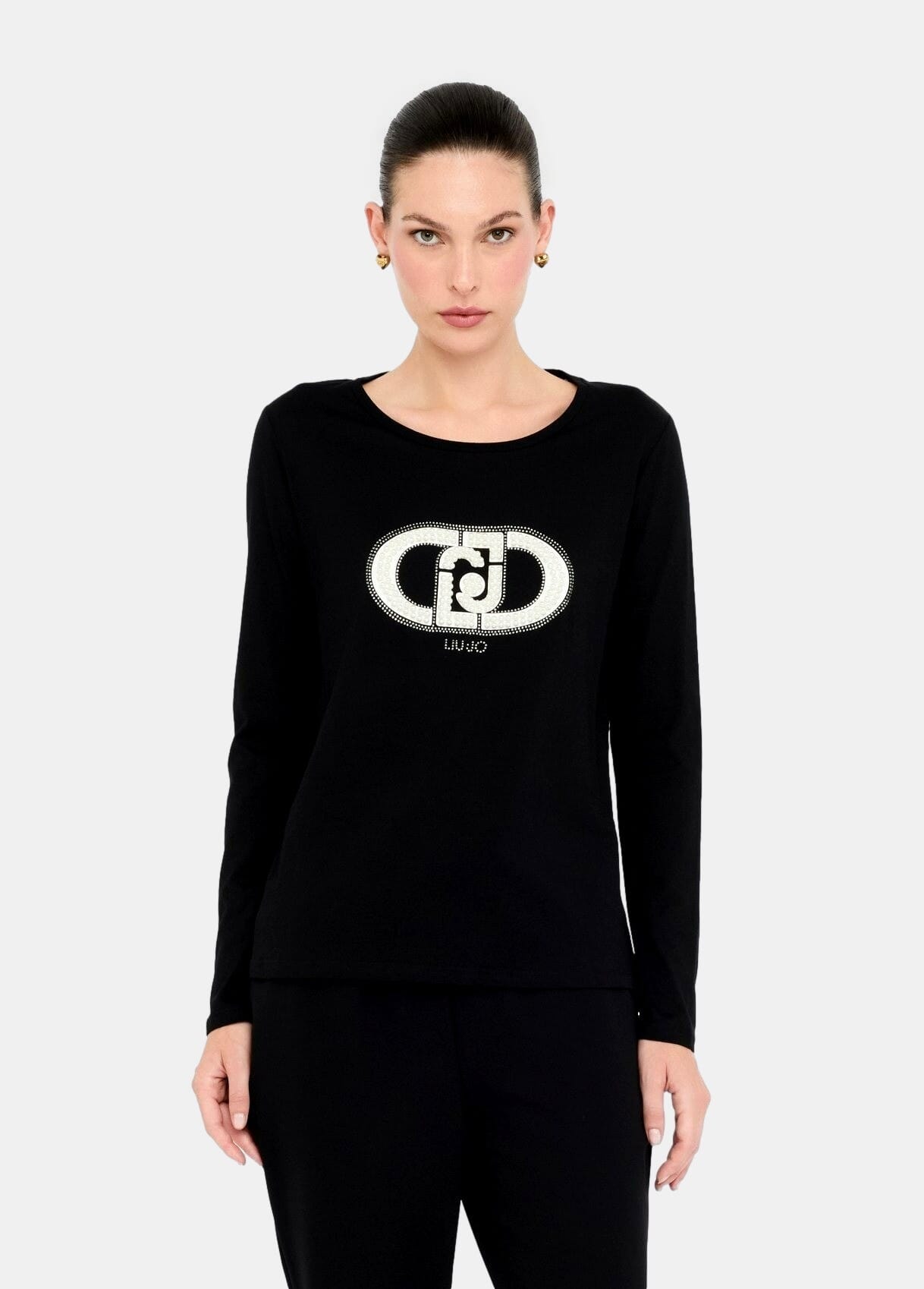 T-shirt realizzata in jersey di cotone,logo con strass e borchie,scollo rotondo,maniche lunghe.