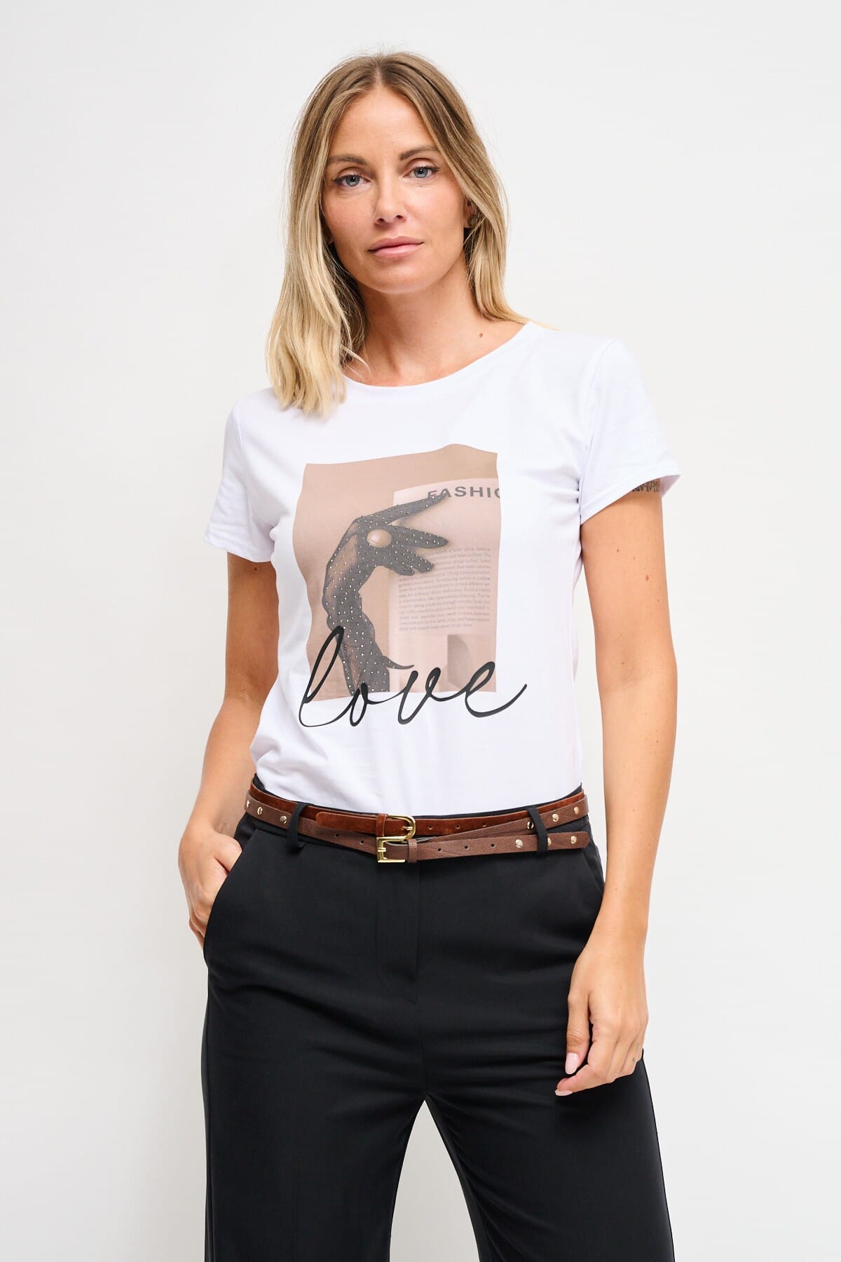 Maryley firma una maglia dal fit regular che accarezza la silhouette con comfort. Jersey di cotone morbido e traspirante, stampa frontale effetto collage con dettaglio lettering e micro-borchie lucide. Girocollo pulito. Perfetta per l’everyday e per un casual office con blazer.