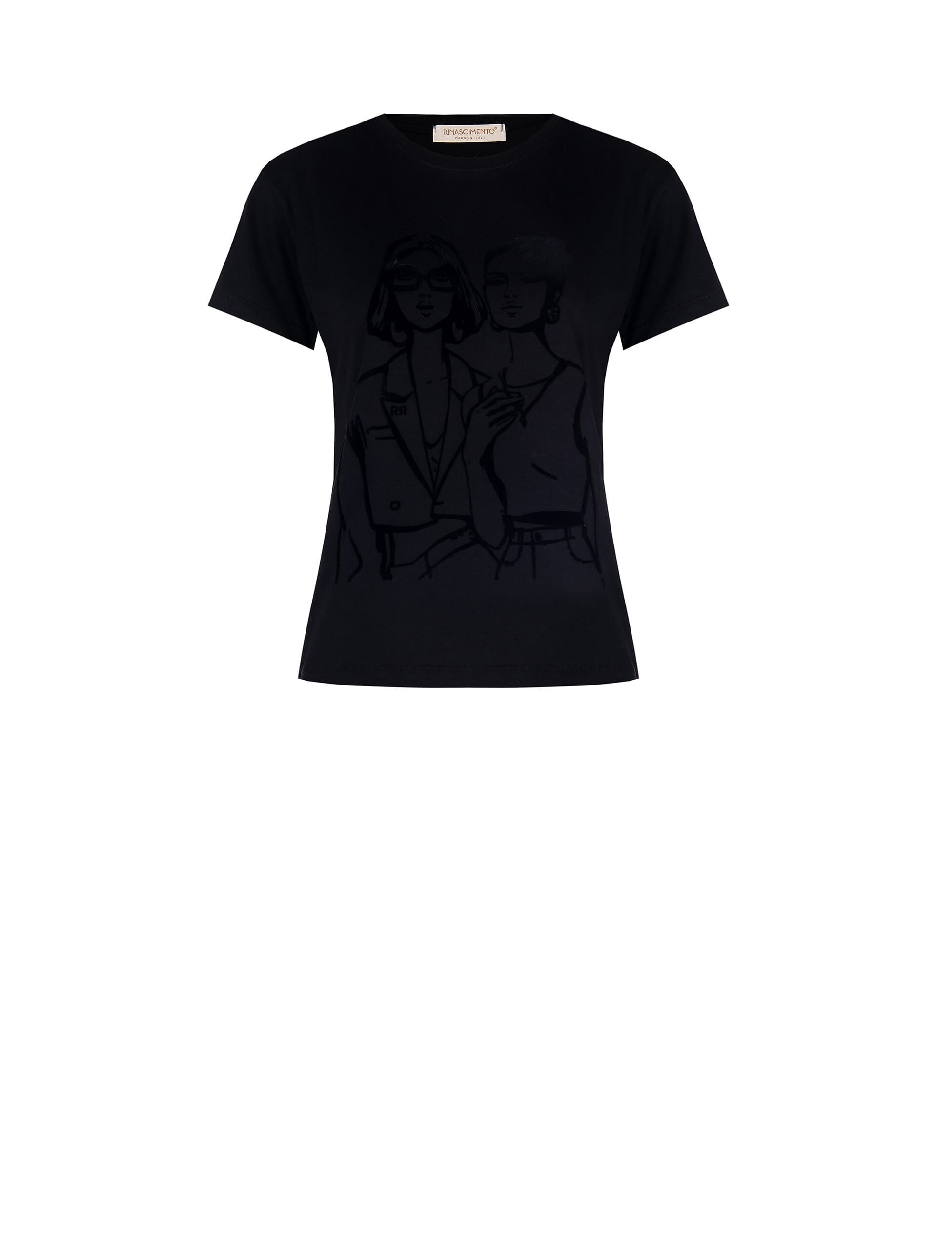 Top in jersey di cotone dalla linea dritta e confortevole, che sfiora il punto vita senza segnare. La stampa flock con figure femminili crea un raffinato effetto rilievo, valorizzato dal girocollo pulito. Perfetto con blazer e denim per l’ufficio o il daily chic.