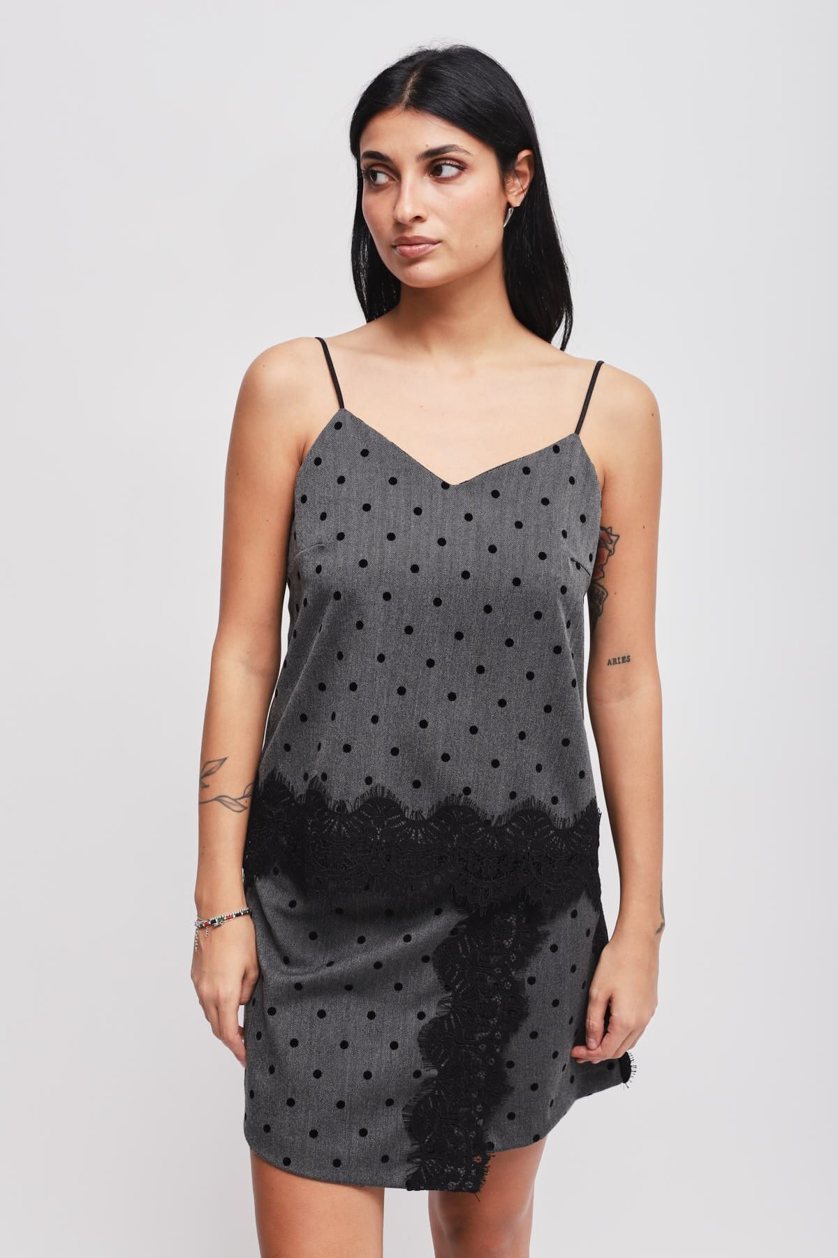 Maryley firma un top scivolato a spalline sottili, fit morbido che valorizza senza segnare. Tessuto fluido con micro pois in rilievo e mano setosa; inserti in pizzo scallop donano movimento. Scollo a V discreto. Perfetto con tailleur per l’ufficio o con denim e tacchi per un after‑work chic.