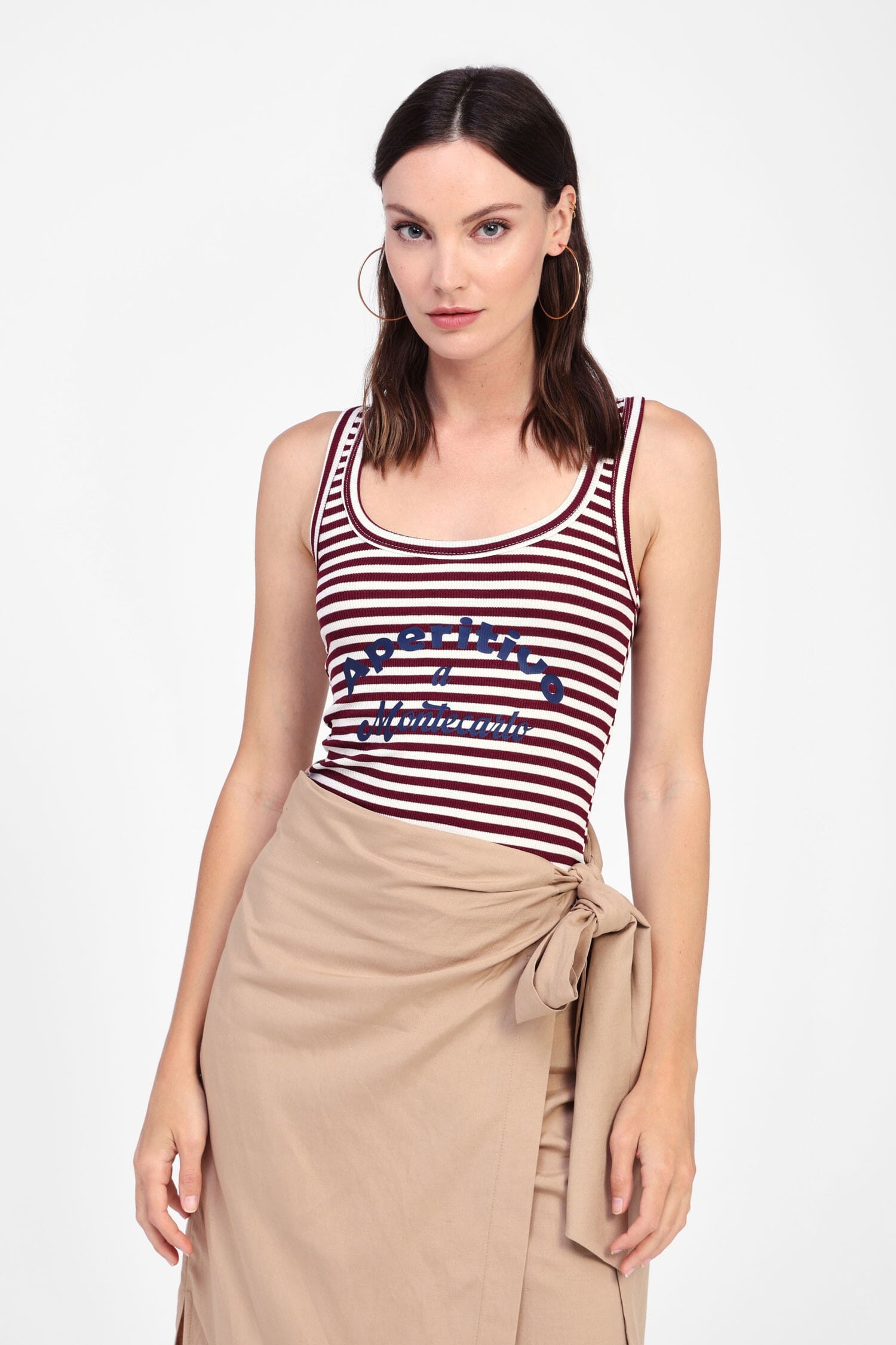 Perfetto per un look casual ma affascinante, il top a righe con spalline combina un tocco di vivacità con comfort quotidiano. Il suo scollo rotondo e la scritta creano un mix giocoso, ideale per passeggiate o aperitivi al tramonto. Lasciati avvolgere dalla sua praticità e funzionalità, accompagnando ogni tuo movimento con leggiadria.