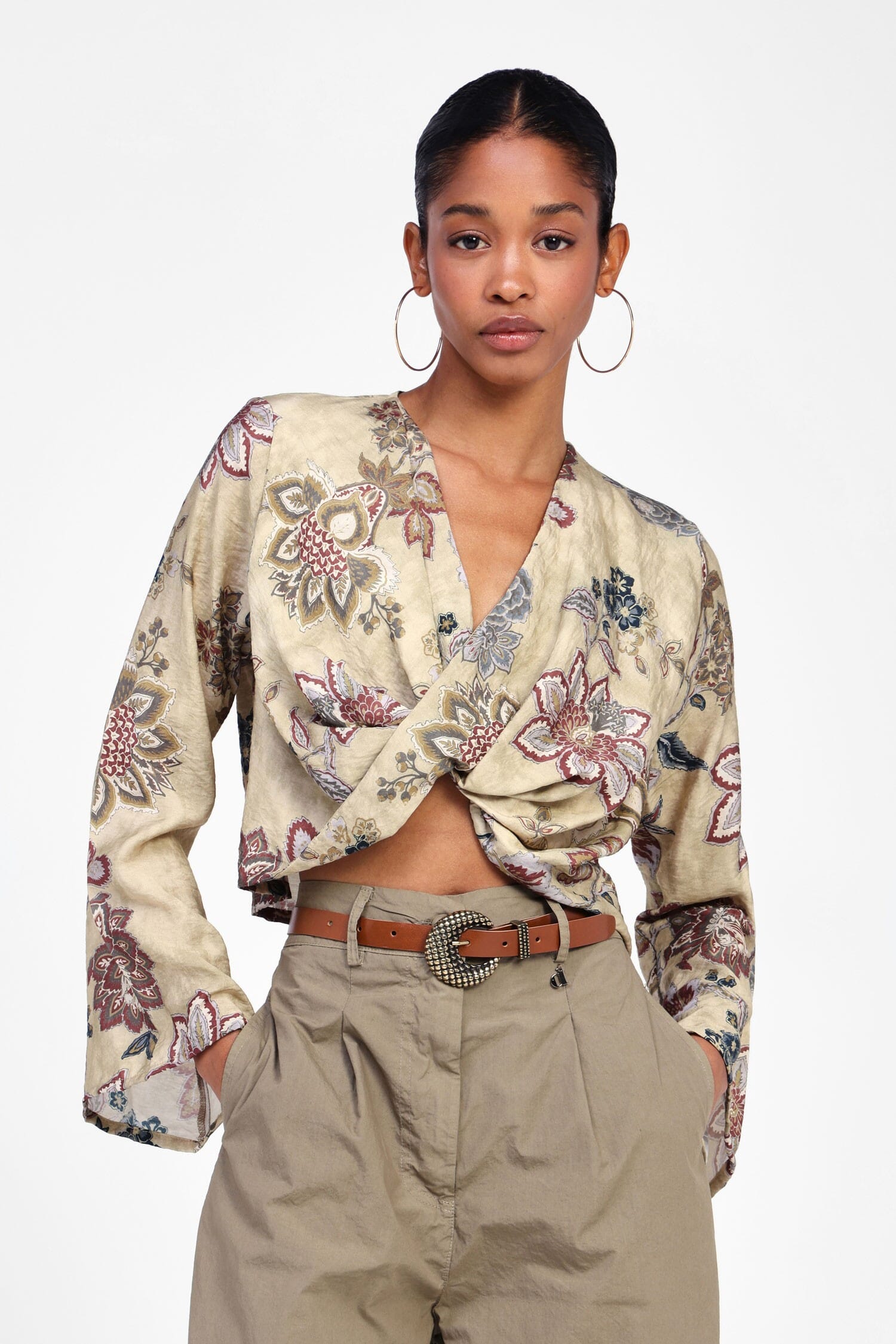 Un top che unisce la grazia di un design femminile con un tocco bohemien. Lo scollo profondo cattura l'attenzione, mentre il motivo floreale aggiunge un fascino naturale. Le maniche ampie e il taglio rilassato offrono comfort e leggerezza, facendoti sentire libera e raffinata in ogni momento della giornata.