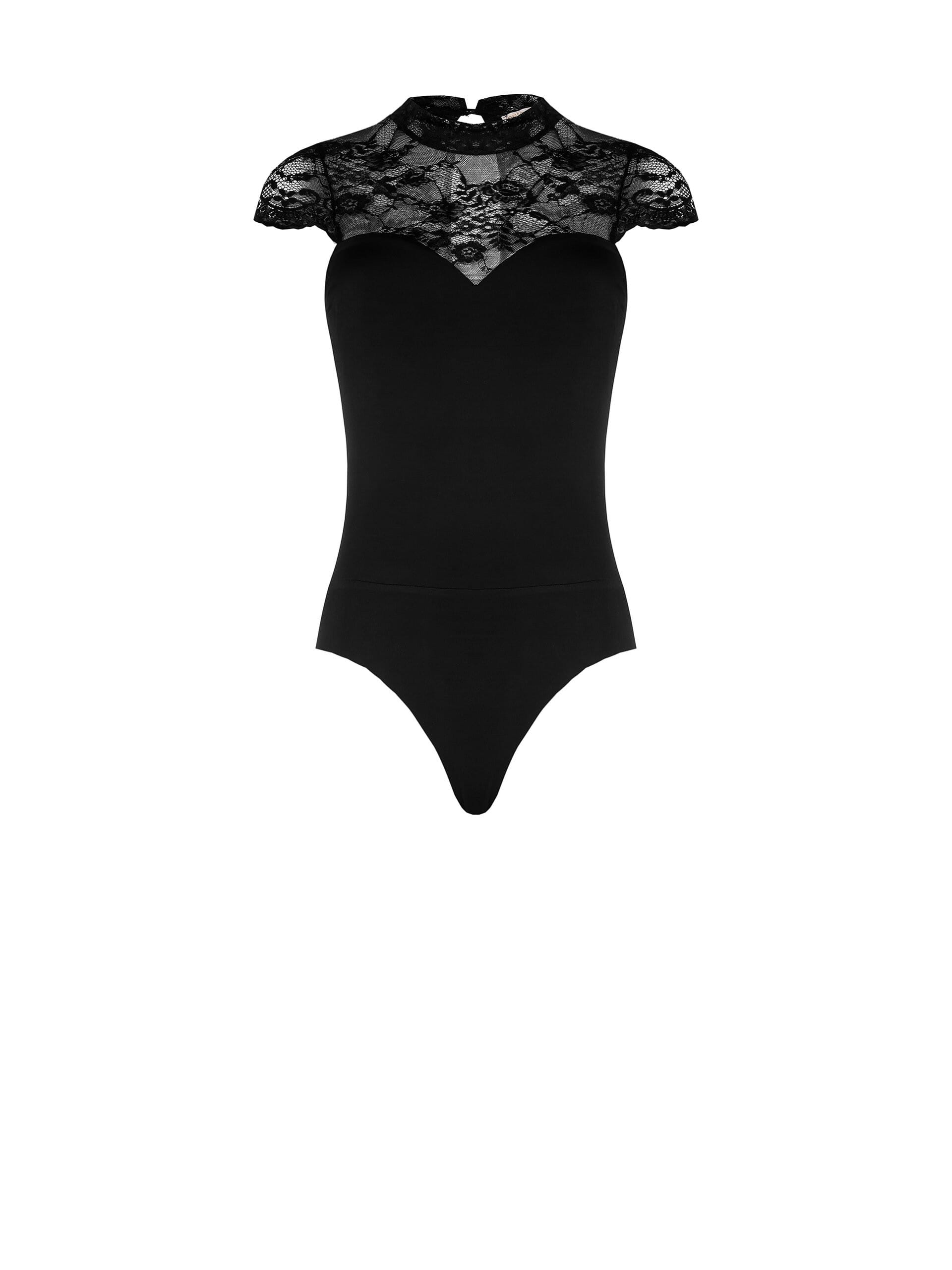 Capo aderente in morbida maglia elasticizzata che valorizza la silhouette, impreziosito da inserto in pizzo trasparente sul décolleté e sul retro con apertura a goccia. Perfetto sotto blazer per l’ufficio o da solo per una serata speciale.