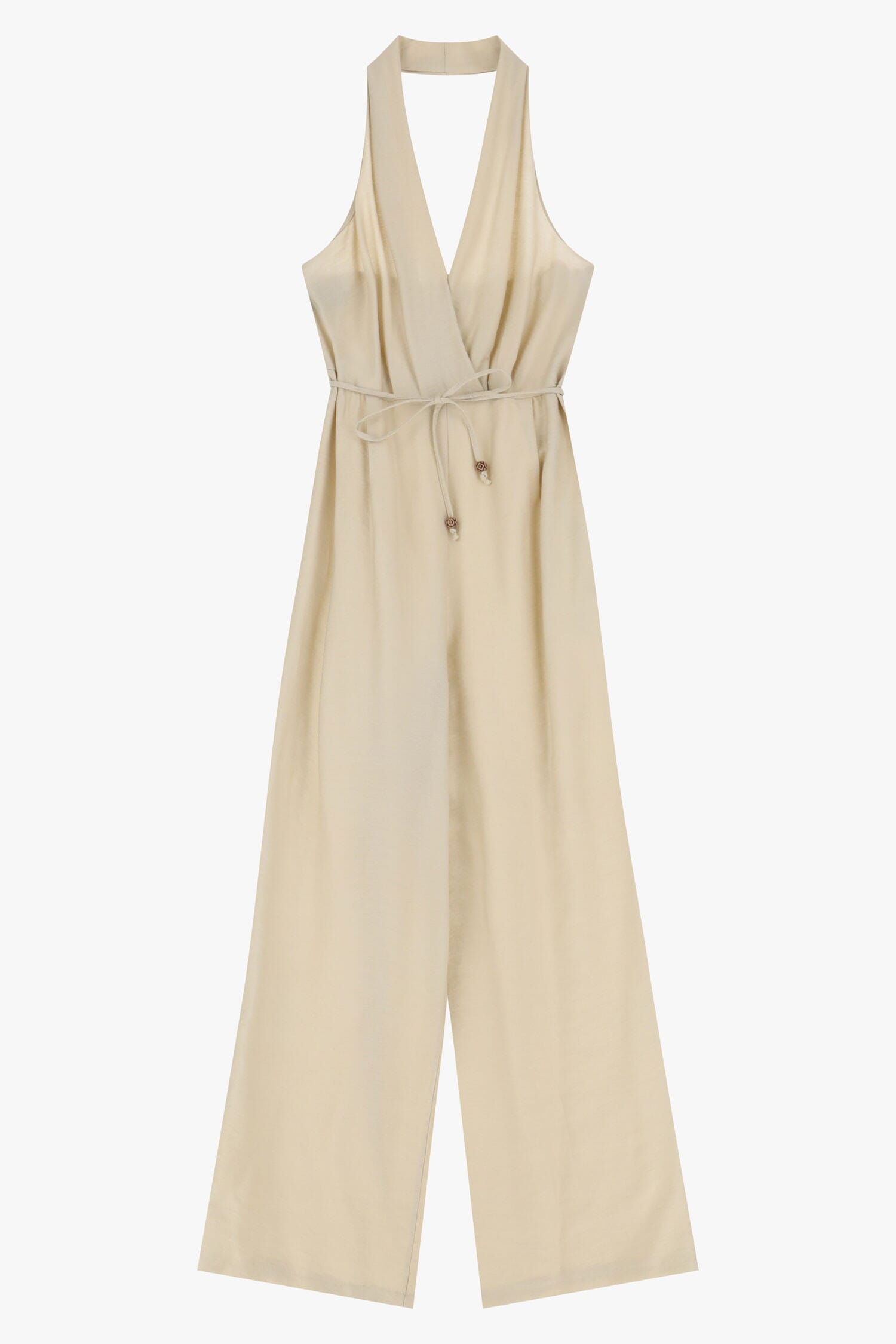Un'elegante jumpsuit con scollo halter che esprime un fascino discreto. Dettagliata con un laccio in vita, offre un comfort senza pari per l'uso quotidiano. Il design a tinta unita permette di abbinarlo facilmente a diversi accessori. Un capo versatile per ogni occasione, dal lavoro alle uscite serali.