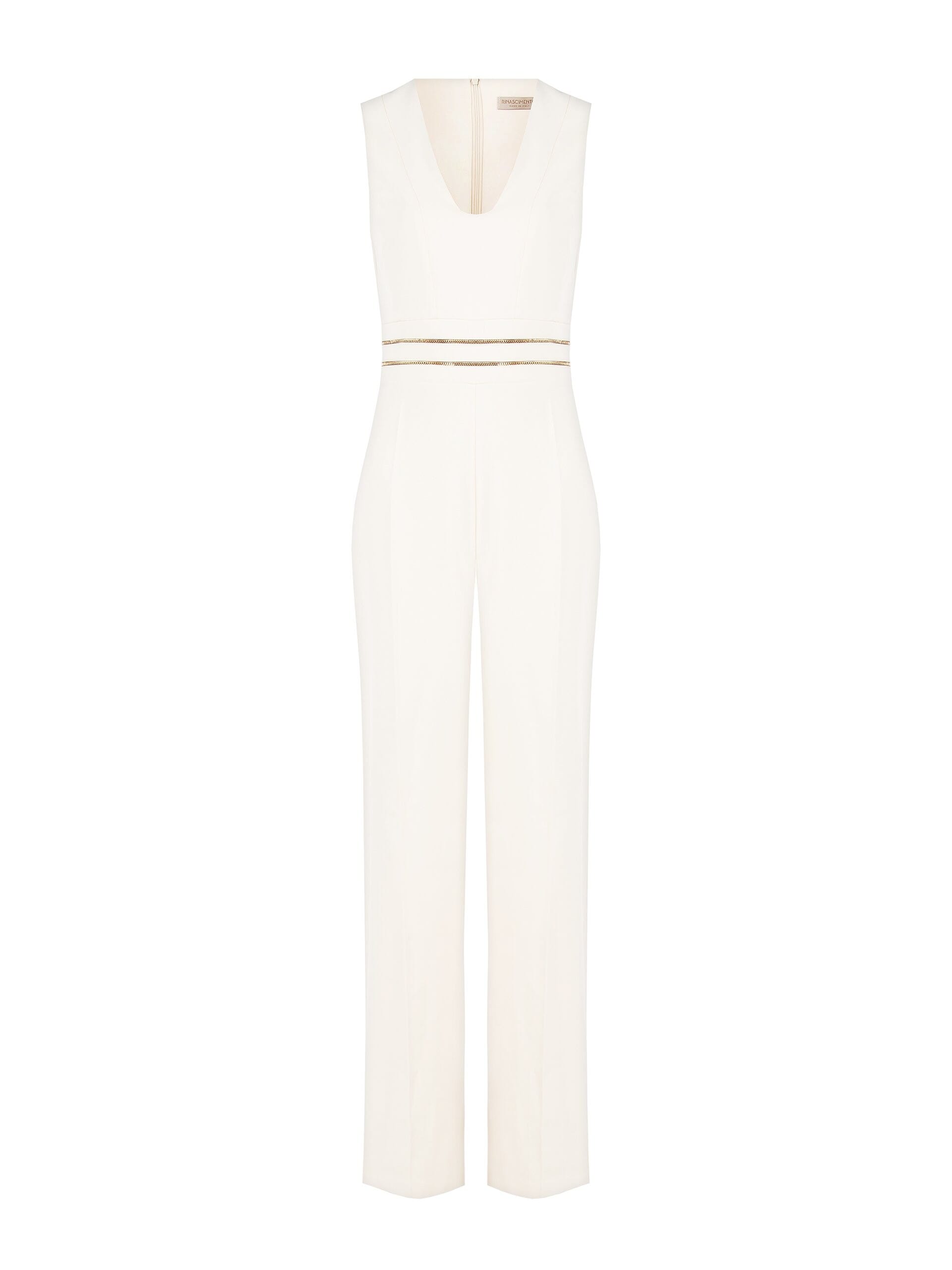 Jumpsuit Rinascimento dal taglio dritto e fit asciutto che slancia la silhouette. Realizzato in tessuto bi‑stretch morbido e confortevole. Scollo a V discreto, cintura in vita con doppio profilo metallico e zip sul retro. Perfetto dall’ufficio all’aperitivo: bastano un blazer di giorno e sandali by night.