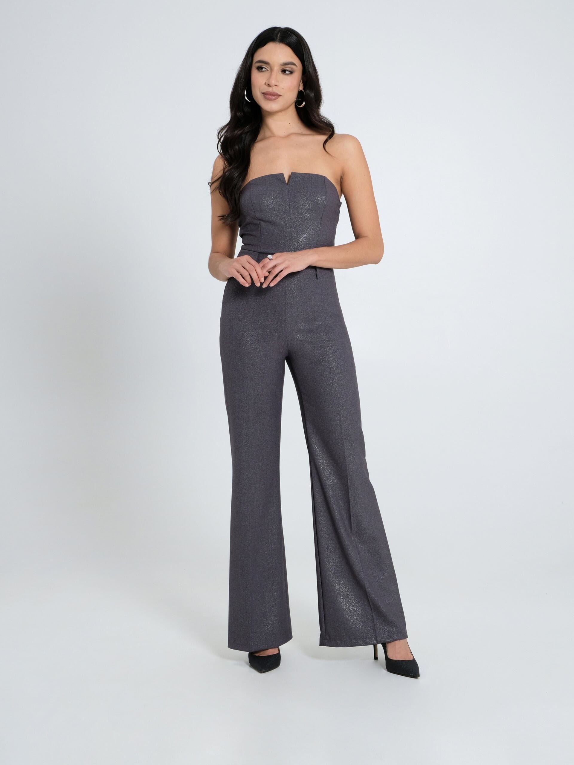 Jumpsuit elegante a gamba ampia, fit slanciato che definisce il punto vita. Tessuto lamé leggero con micro-brillantezza per un effetto luce discreto e confortevole. Corpino con scollo a V rovesciata e spalline rimovibili; piccoli dettagli gioiello sul punto vita. Perfetta per party e occasioni speciali.