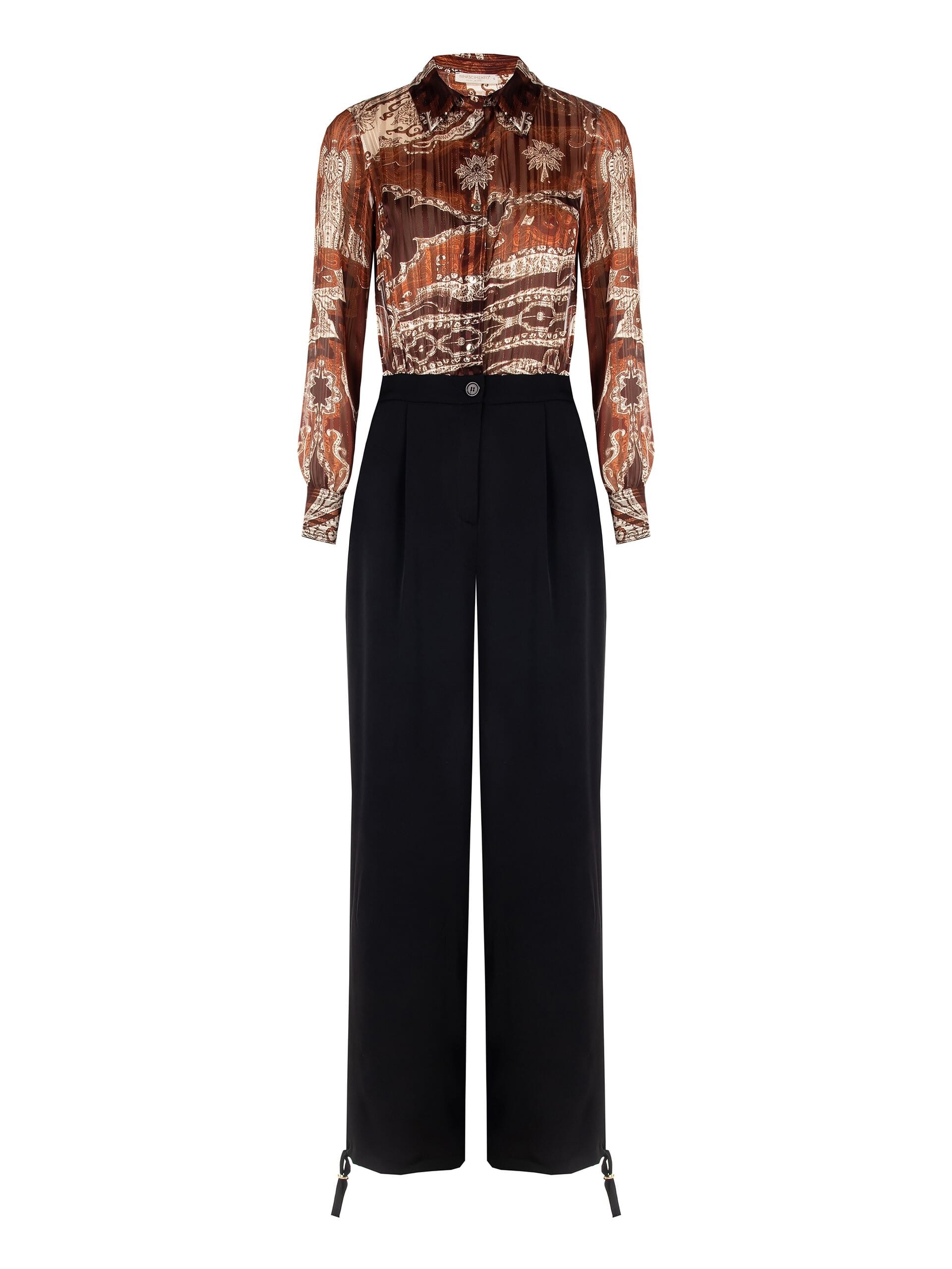 Rinascimento firma un capo one‑piece dal fit morbido in alto e gamba dritta che slancia. Corpino in georgette leggermente trasparente con stampa, collo a punta e bottoni gioiello; pantalone fluido in tessuto tecnico con pince e caviglia regolabile con mini fibbie. Perfetto dall’ufficio all’aperitivo, con comfort e allure immediata.