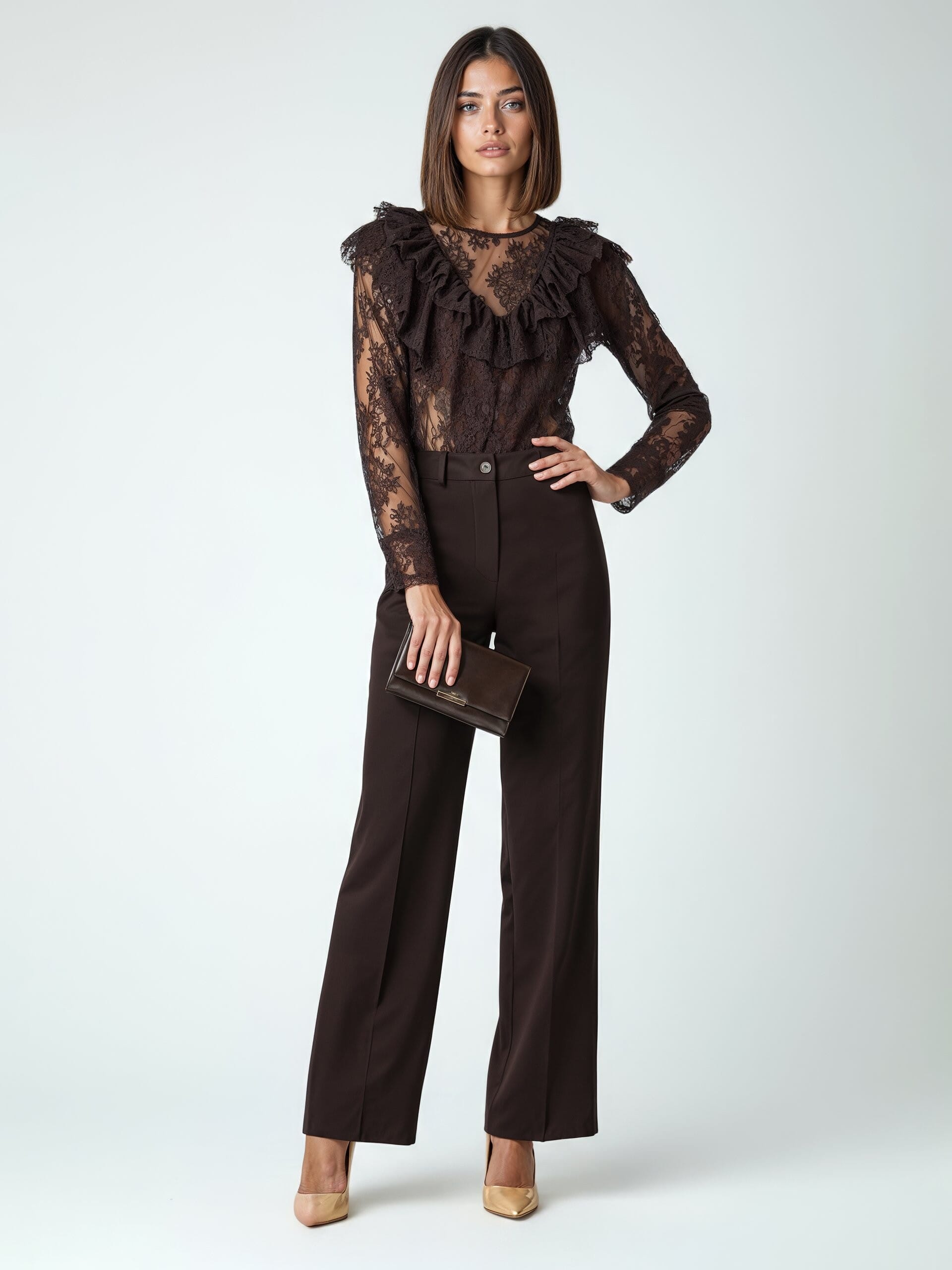 Eleganza Rinascimento in un capo unico: top in pizzo leggero con ruches che valorizzano il décolleté e maniche velate, abbinato a pantaloni in tessuto fluido a gamba dritta per un fit slanciato e confortevole. Scollatura a V con apertura sul retro e chiusura a bottone. Perfetto per party e cene, versatile anche per eventi serali.